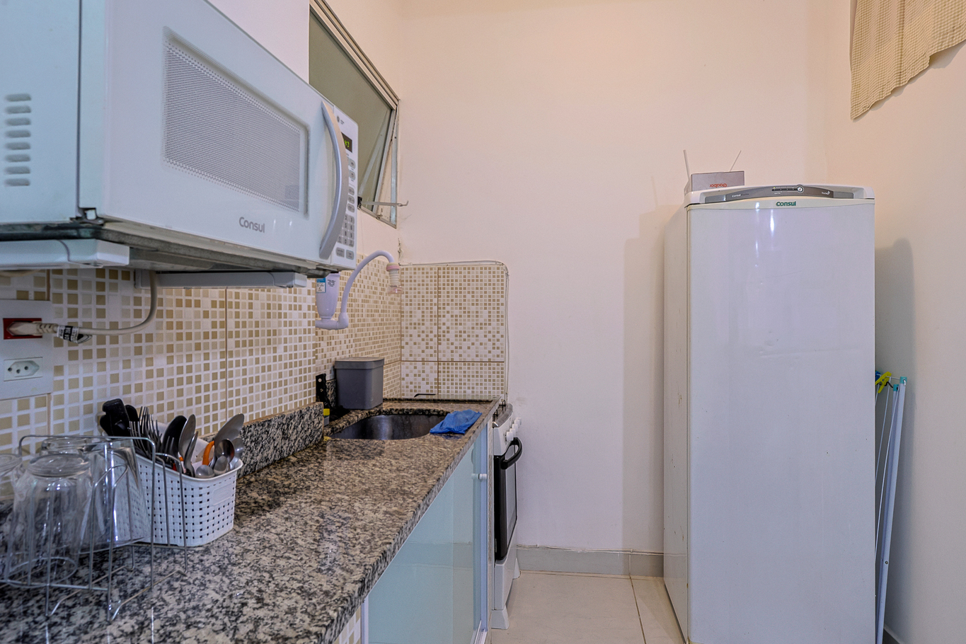 - Cozinha completa equipada com balcão funcional para refeições rápidas, freezer, fogão, forno, geladeira, microondas, cafeteira italiana,pratos, copos, talheres, panelas, panos de prato e outros utensílios(exceto sal e óleo)