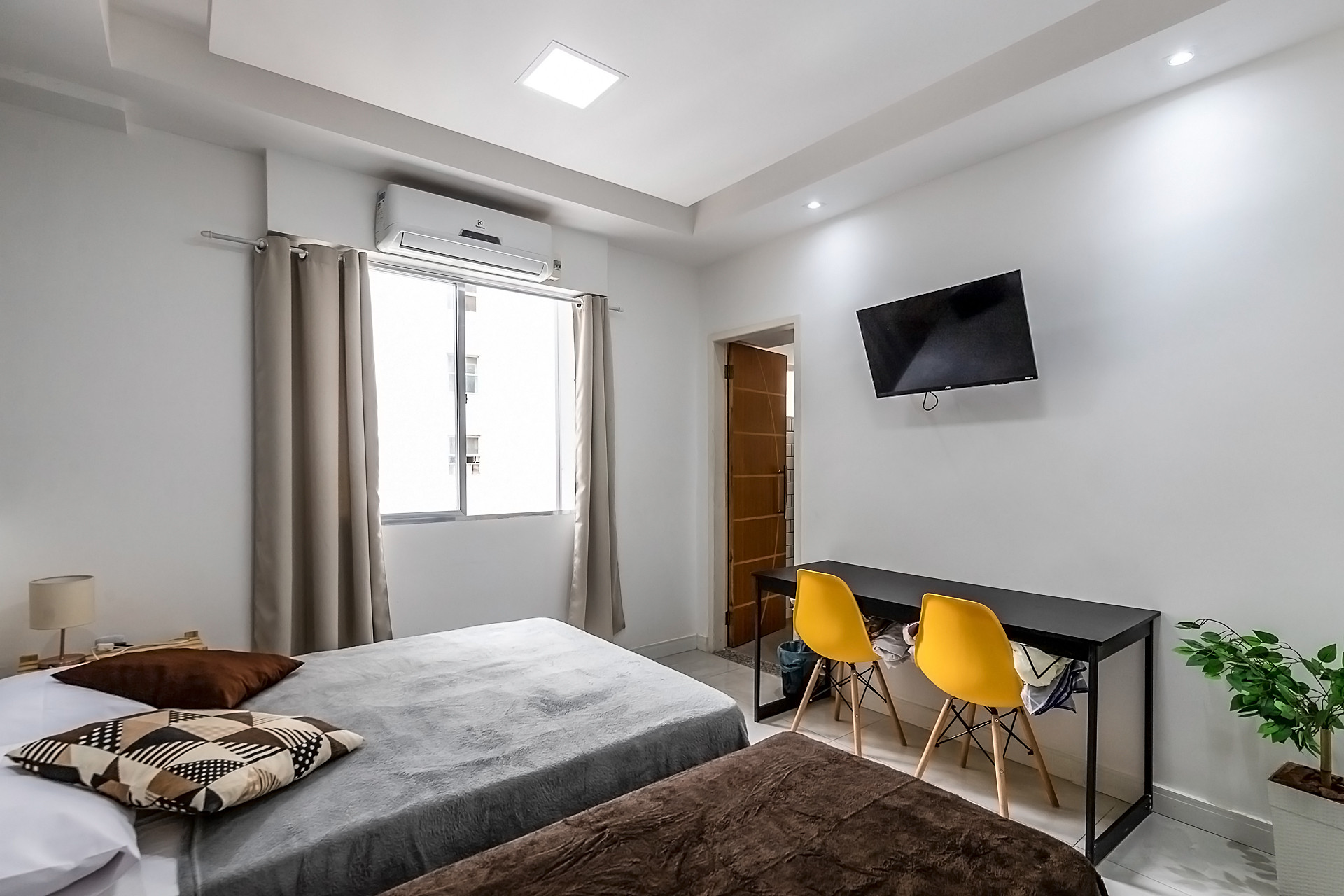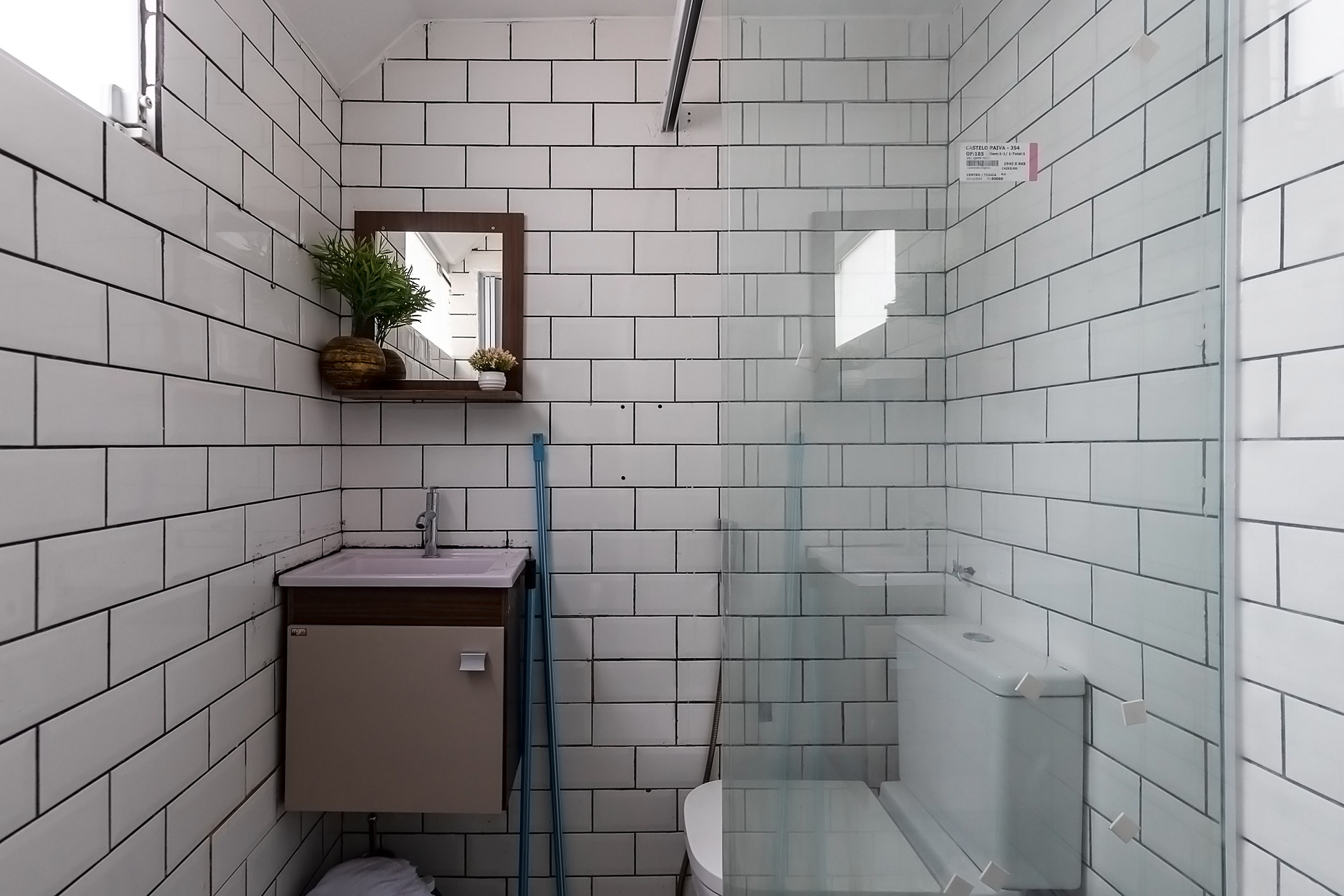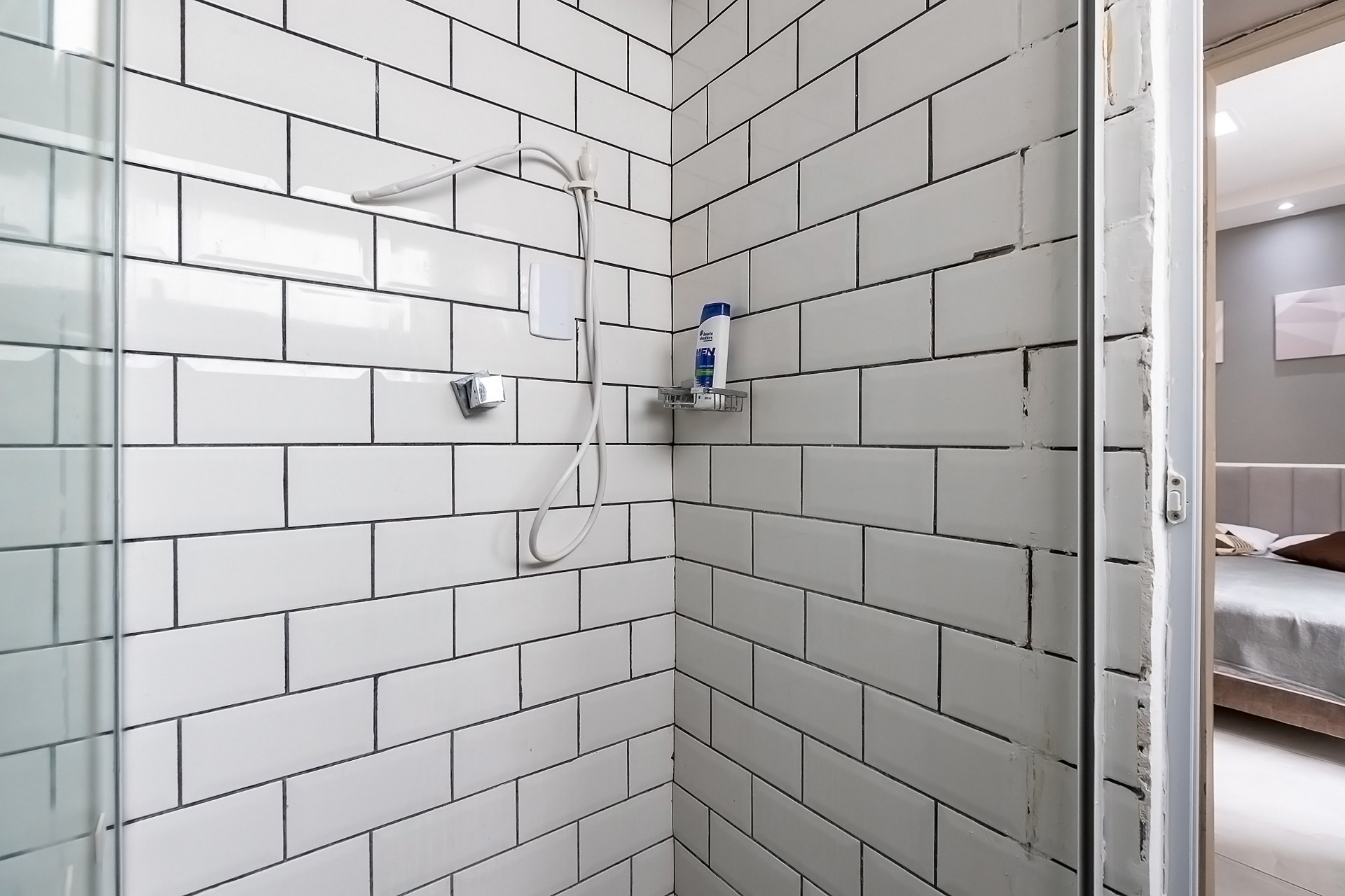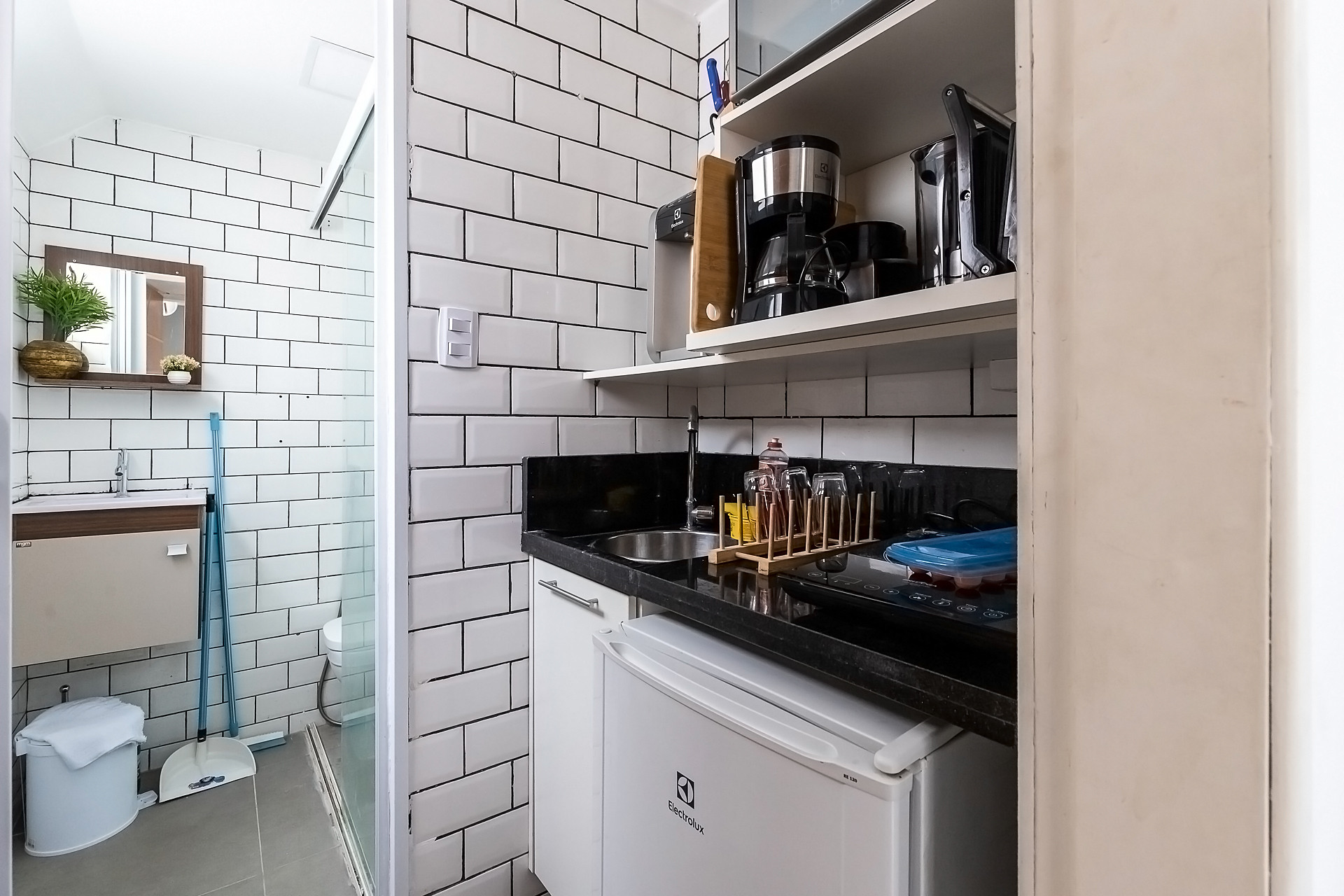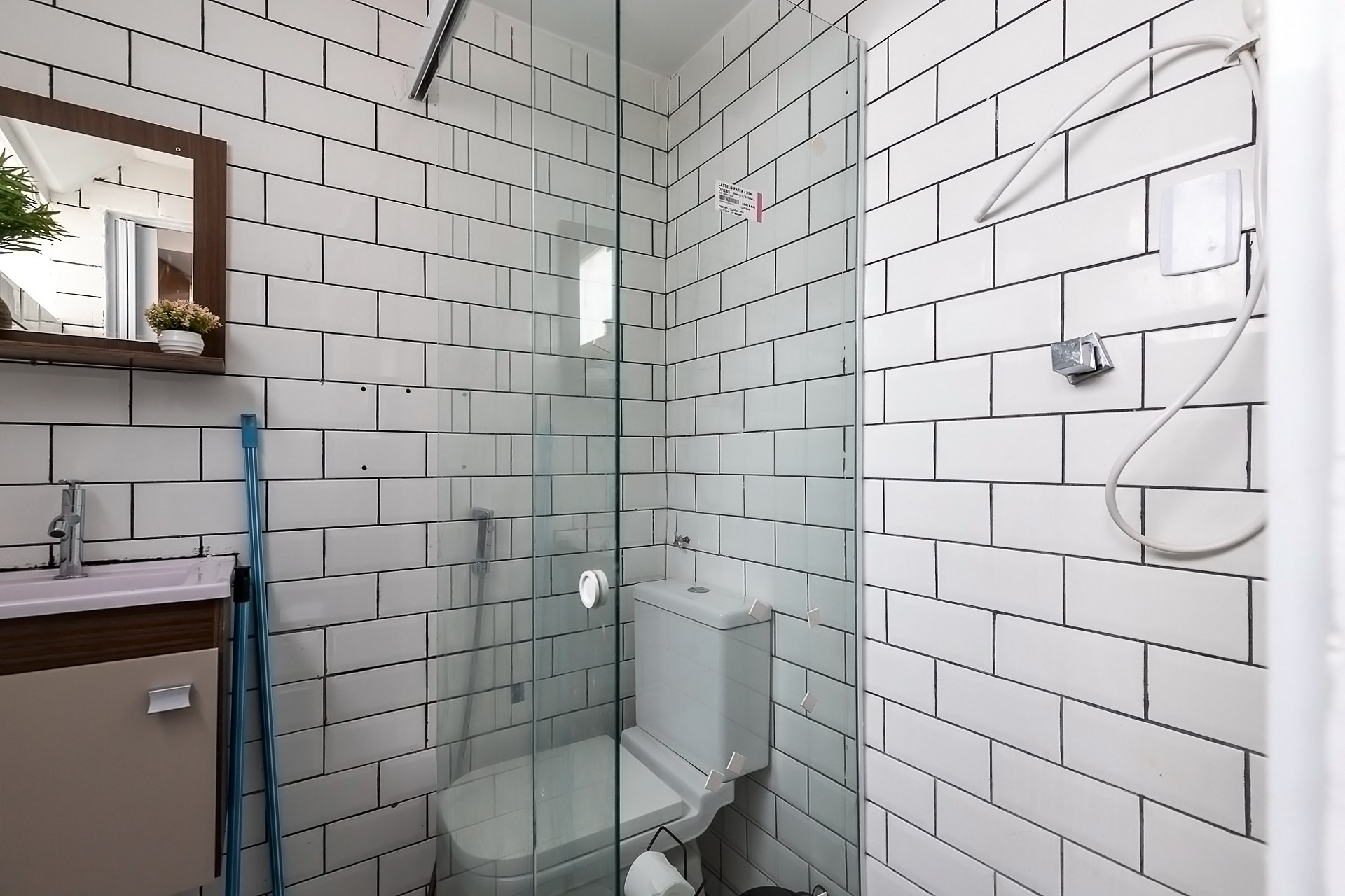- O banheiro possui chuveiro elétrico e box de vidro/acrílico