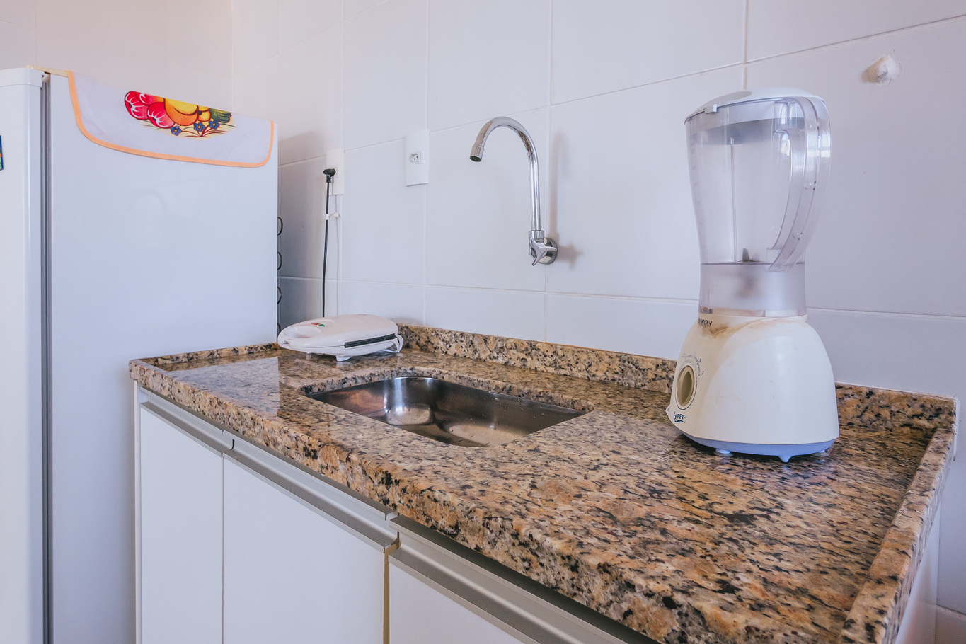 - A cozinha é equipada com diversos utensílios, incluindo fogão, geladeira e liquidificador (exceto sal, pimenta e óleo)