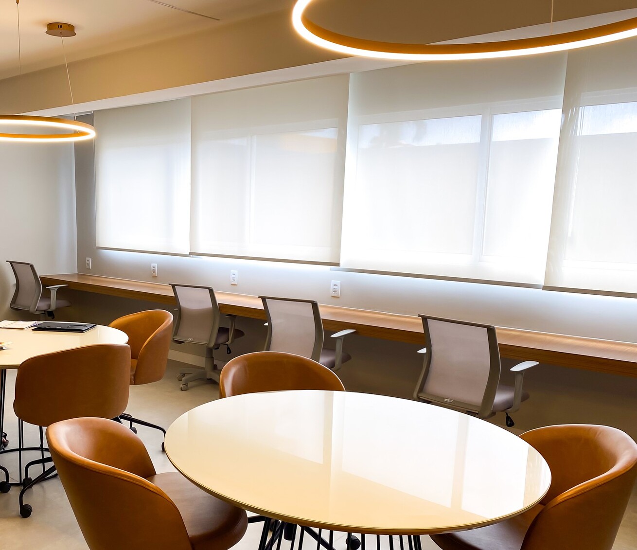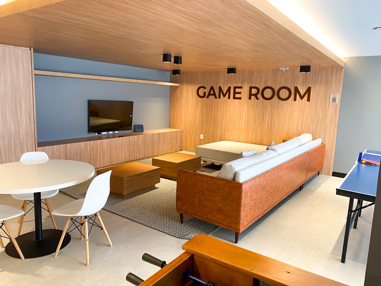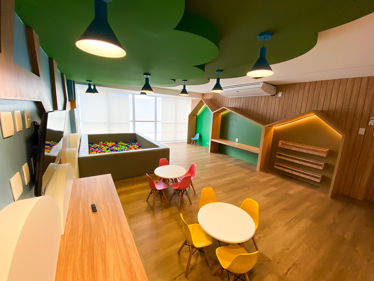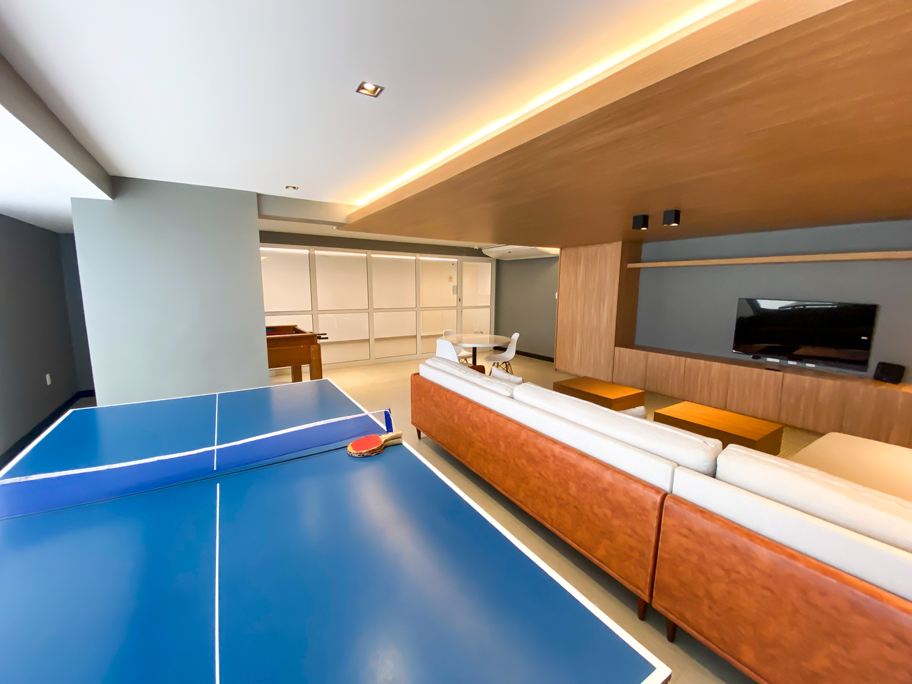 - Sala com sofá-cama, Smart TV e mesa de jantar