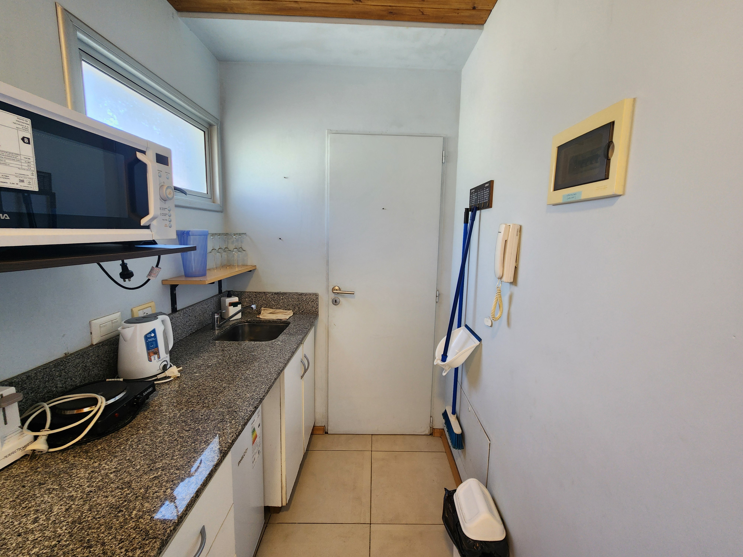 A cozinha americana, elétrica, está equipada com geladeira, micro-ondas, forno, congelador, louça/talheres, utensílios/cozinha, cafeteira, torradeira e jarro elétrico.