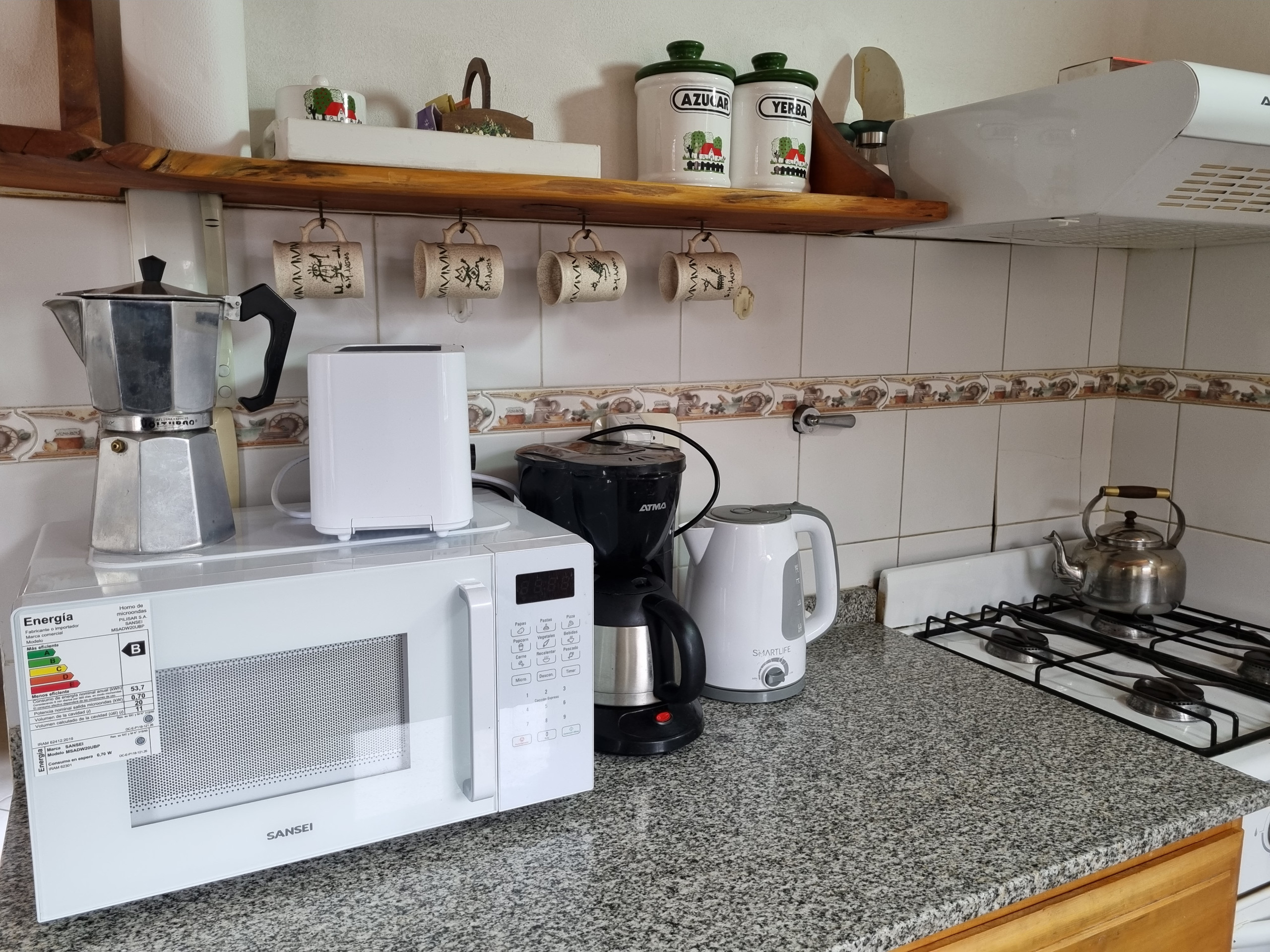 A cozinha americana, de gás, está equipada com geladeira, micro-ondas, forno, congelador, louça/talheres, utensílios/cozinha, cafeteira, torradeira e jarro elétrico.
