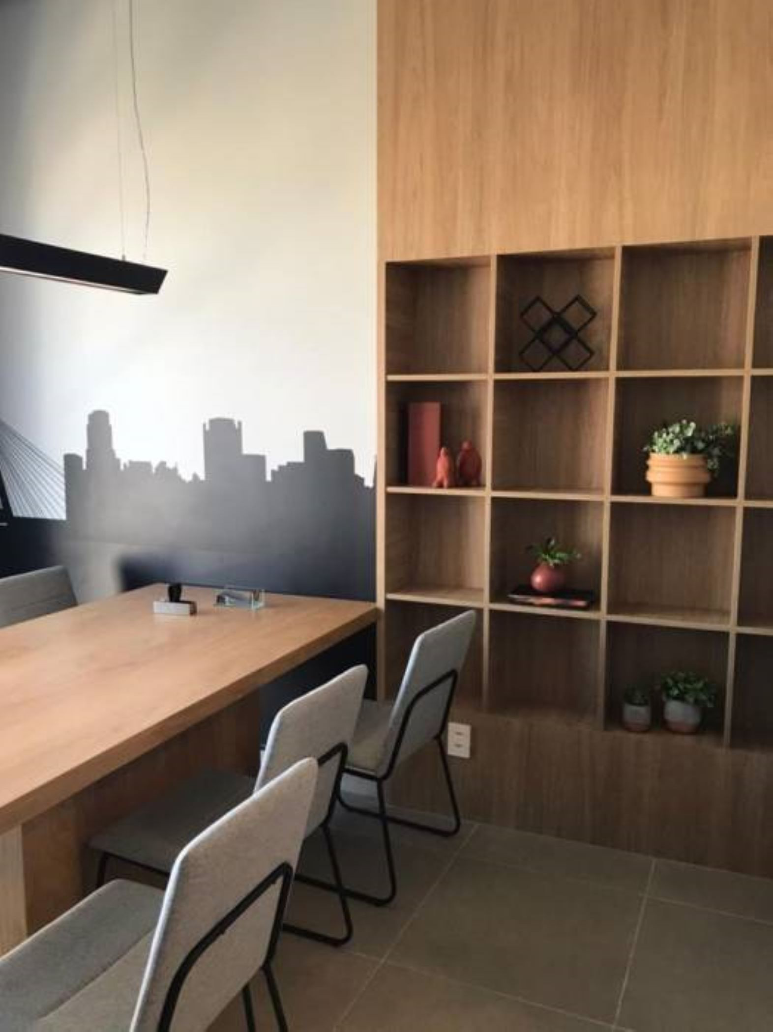 A sala conta com mesa de jantar com 4 cadeiras, sofá, tv de 50 polegadas, internet 200mb, sacada grande com rede para crianças em todas janelas.