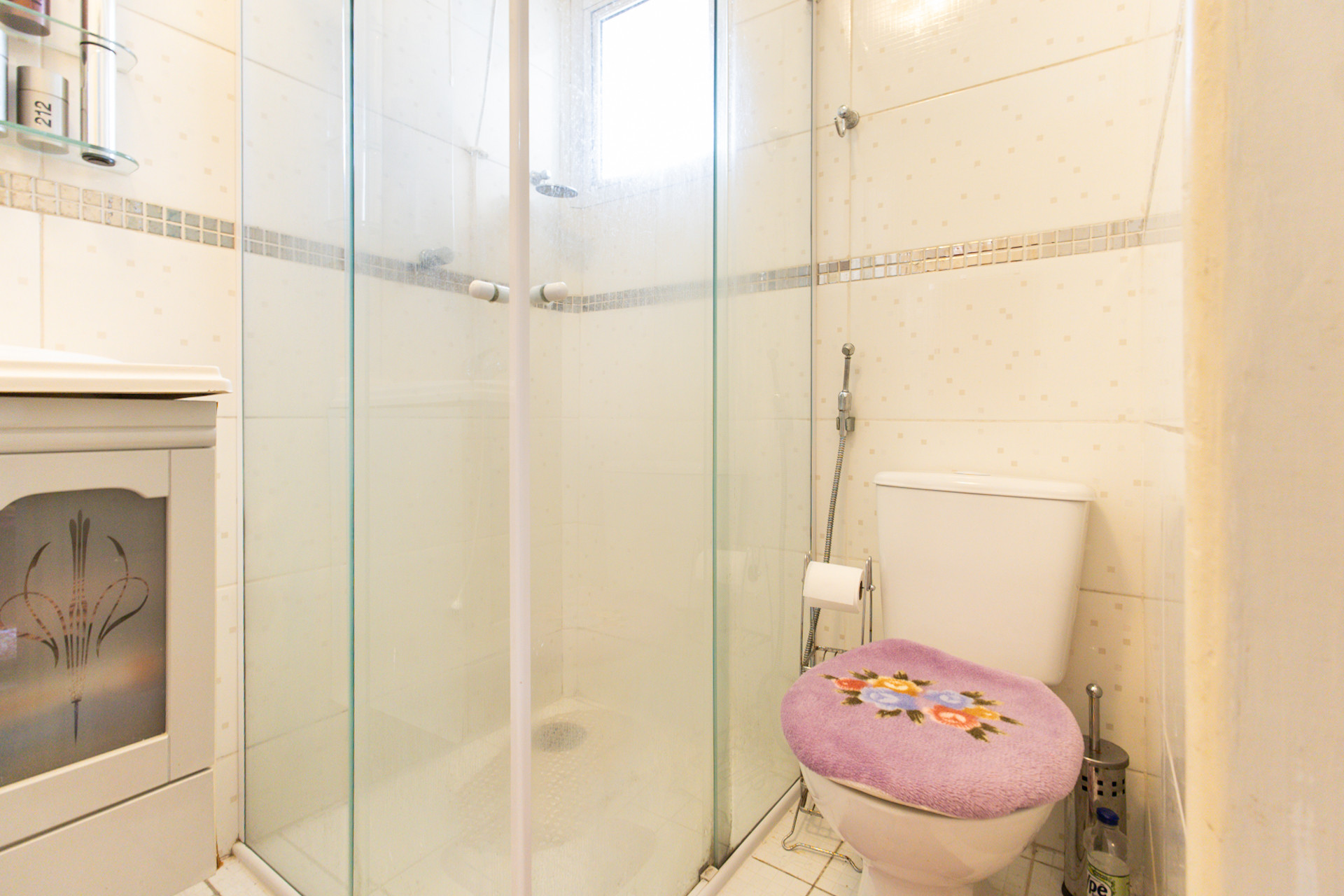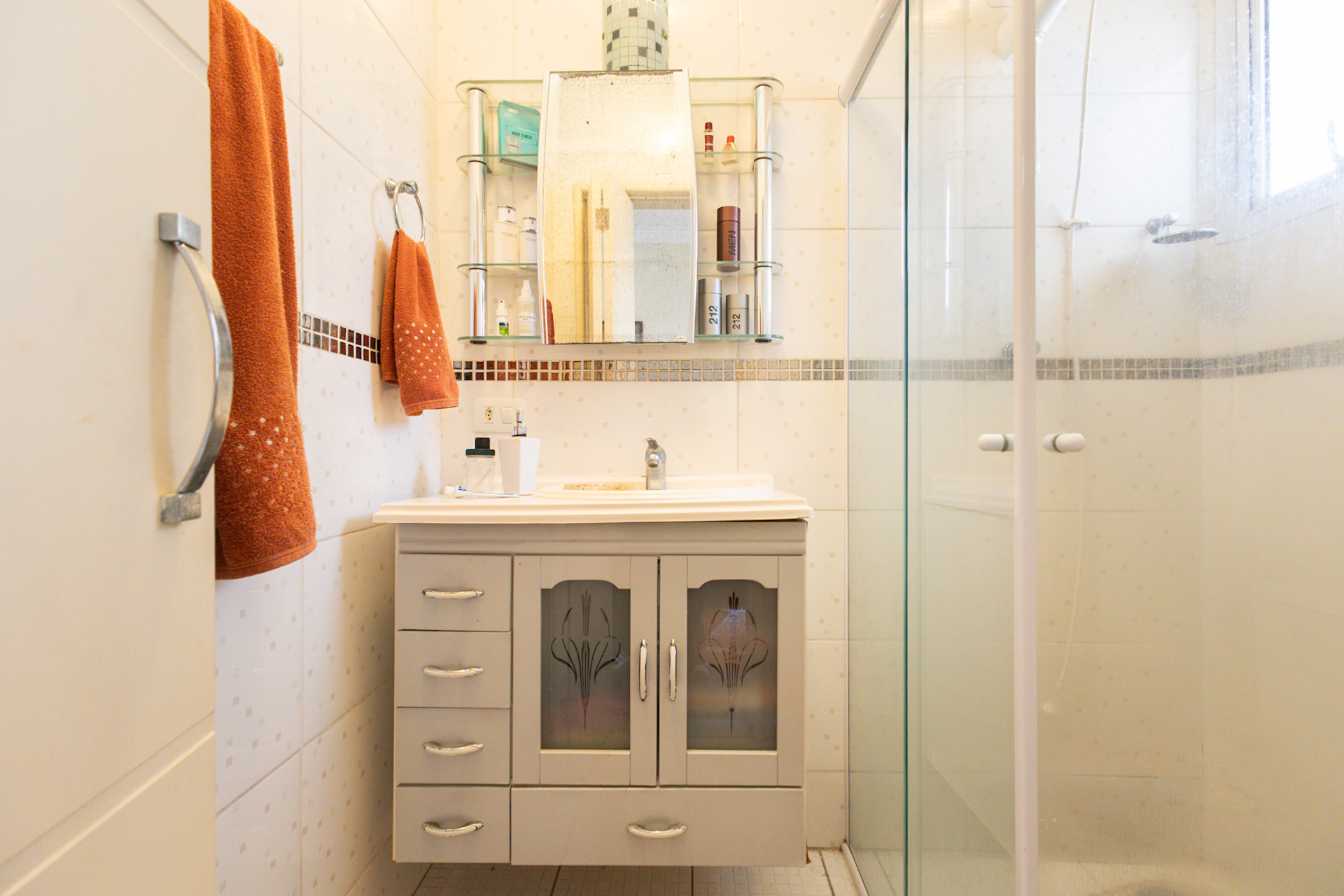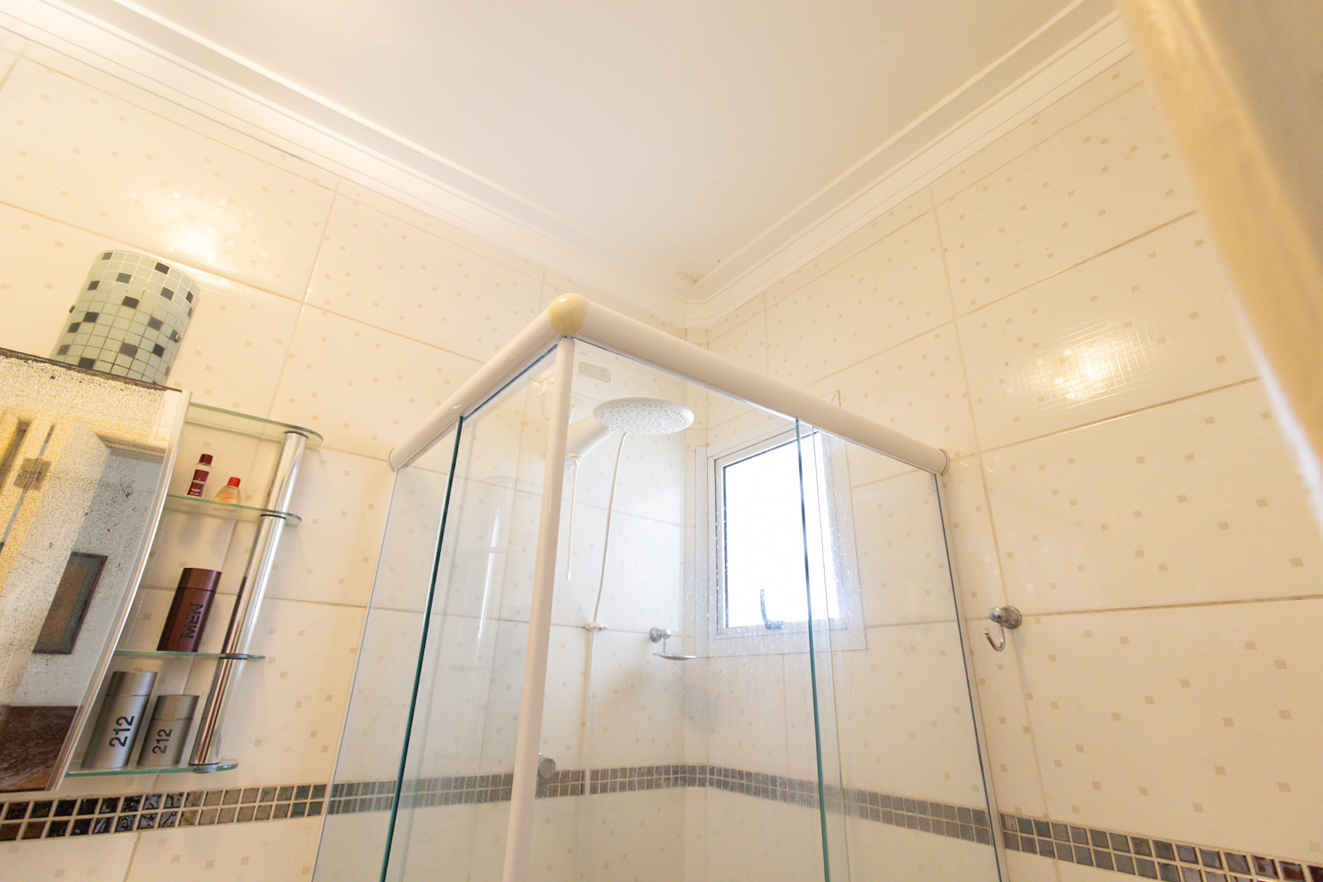 - O banheiro da suíte tem chuveiro elétrico e box de vidro