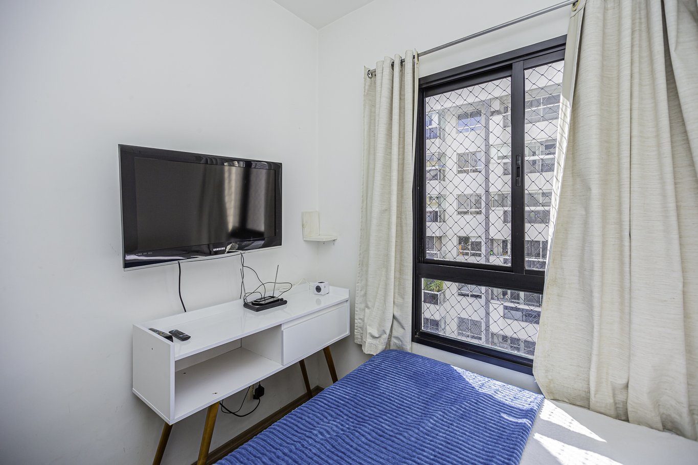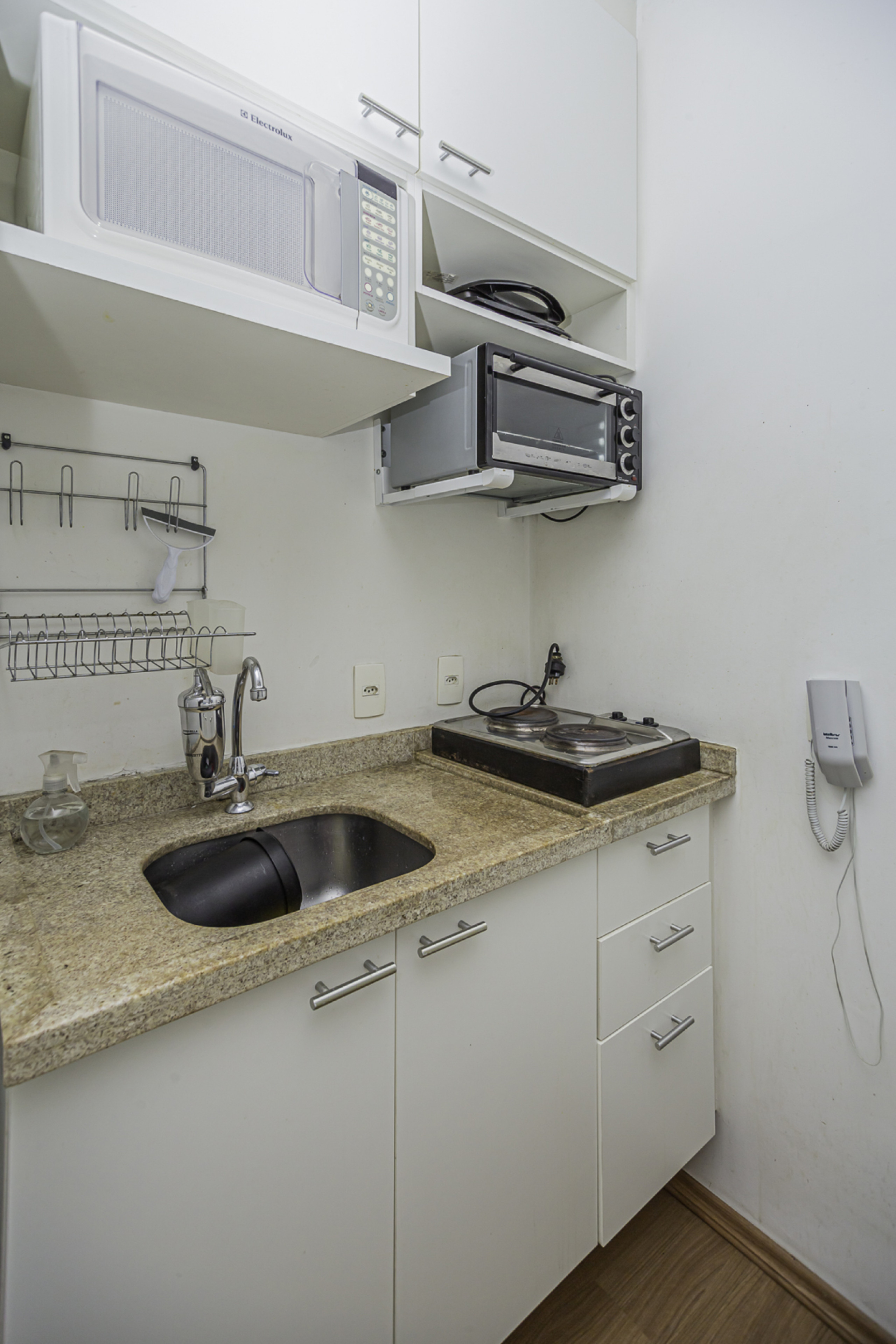 - A cozinha é equipada com fogão elétrico de 2 bocas, forno elétrico, geladeira, microondas, cafeteira, sanduicheira, liquidificador, torradeira, balcão funcional e outros utensílios(exceto óleo e sal)