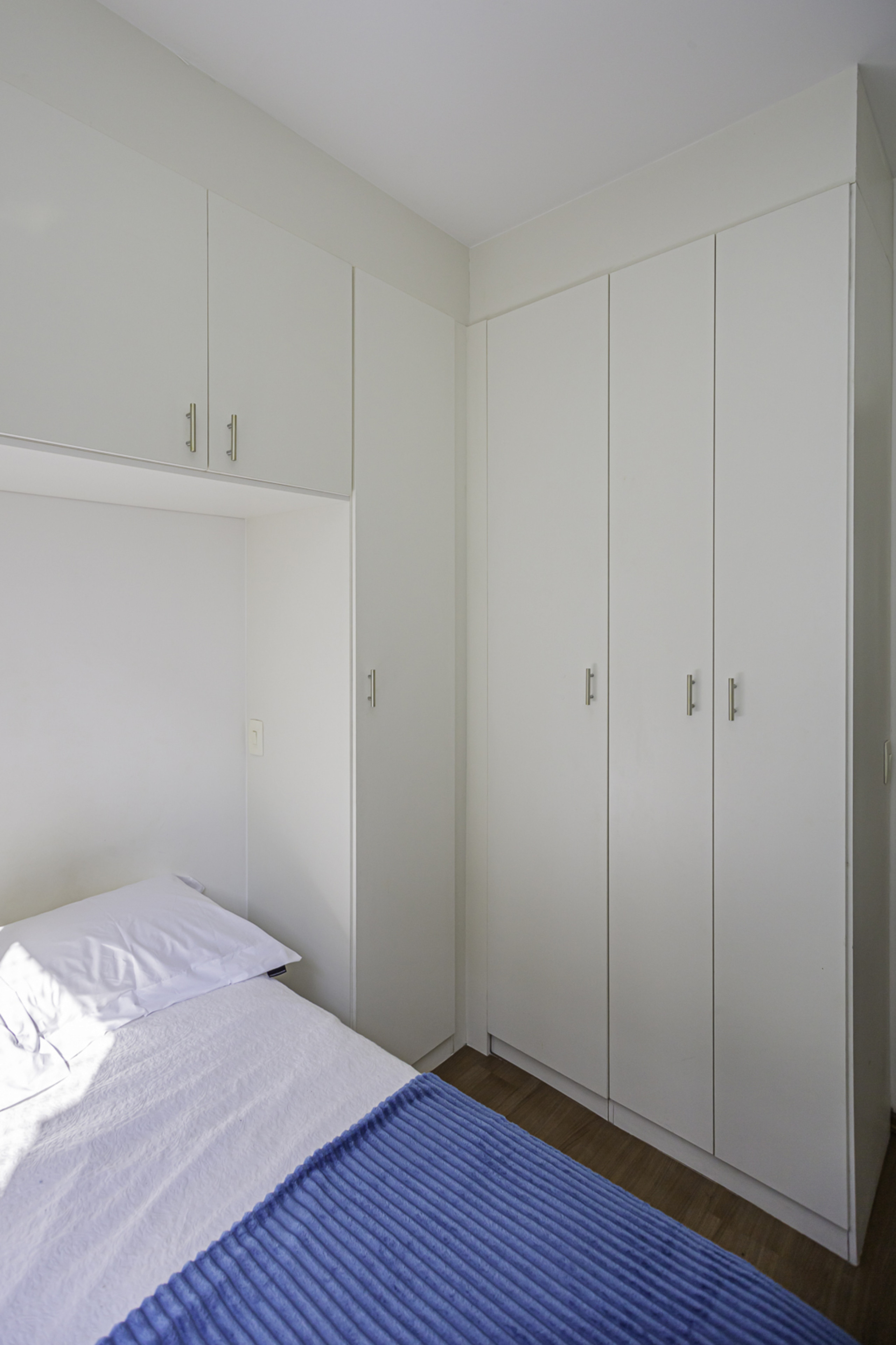 - Quarto com cama de casal, armário, edredom e protetor de colchão