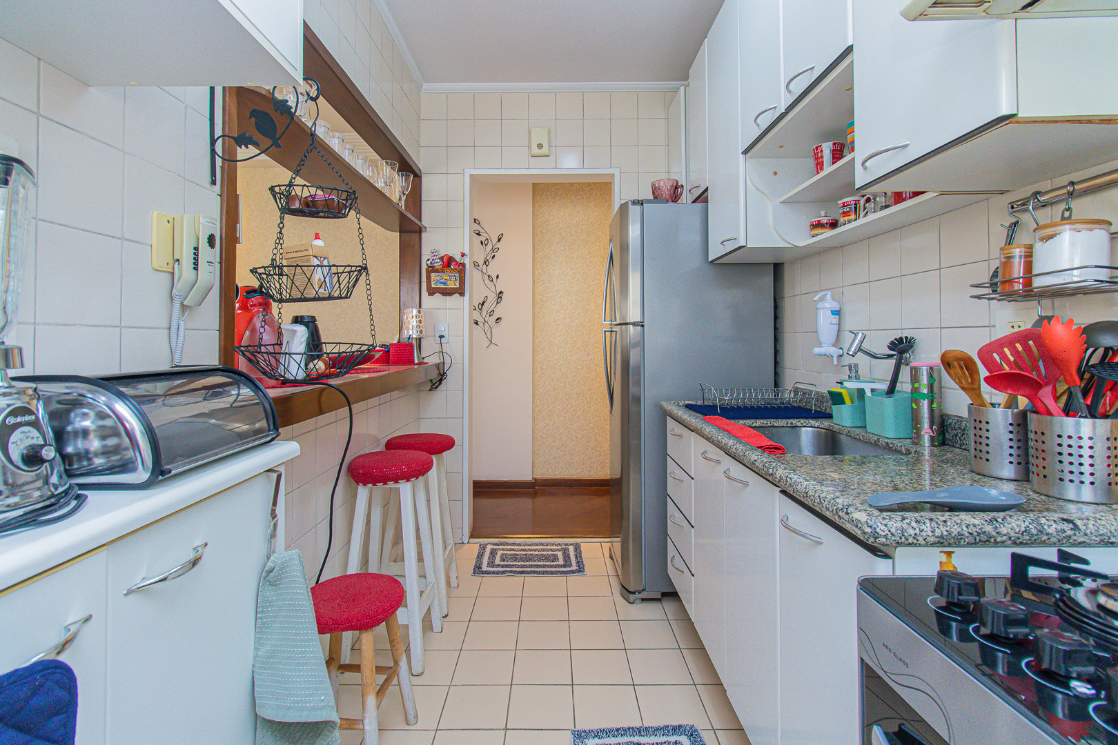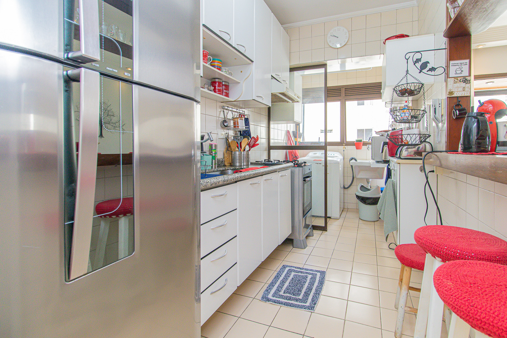- A cozinha é americana e completa para te atender. Ela está equipada com geladeira, fogão, máquina de café, torradeira, além de diversos utensílios