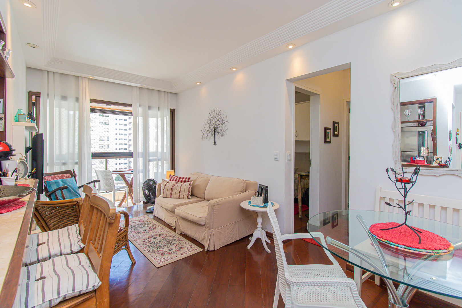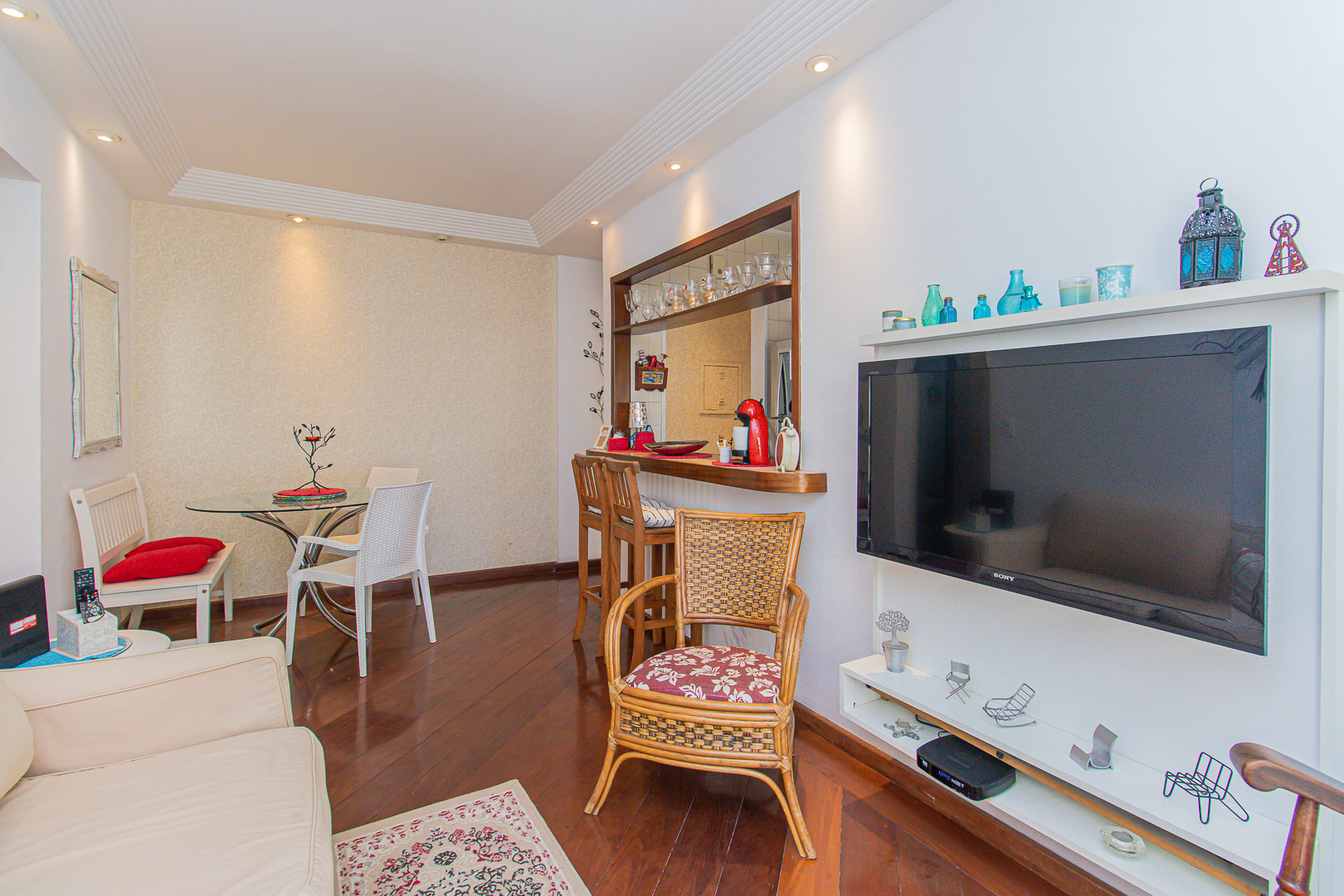 - A sala de estar possui sofá, TV a cabo e uma mesa