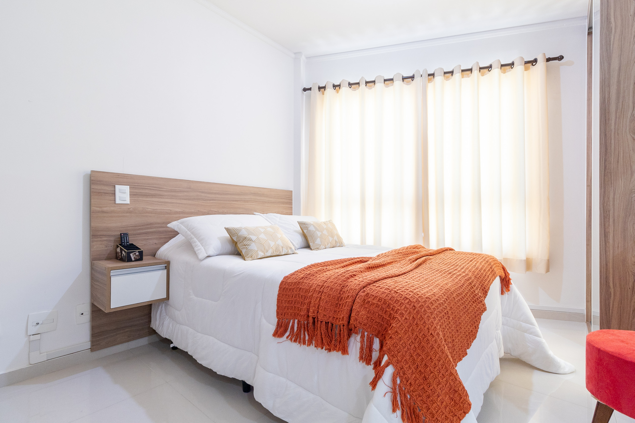 Suíte com guarda-roupa, cama de casal, enxoval contendo lençol, fronhas e cobertor (enxoval extra solicitado durante a estadia tem o custo adicional).