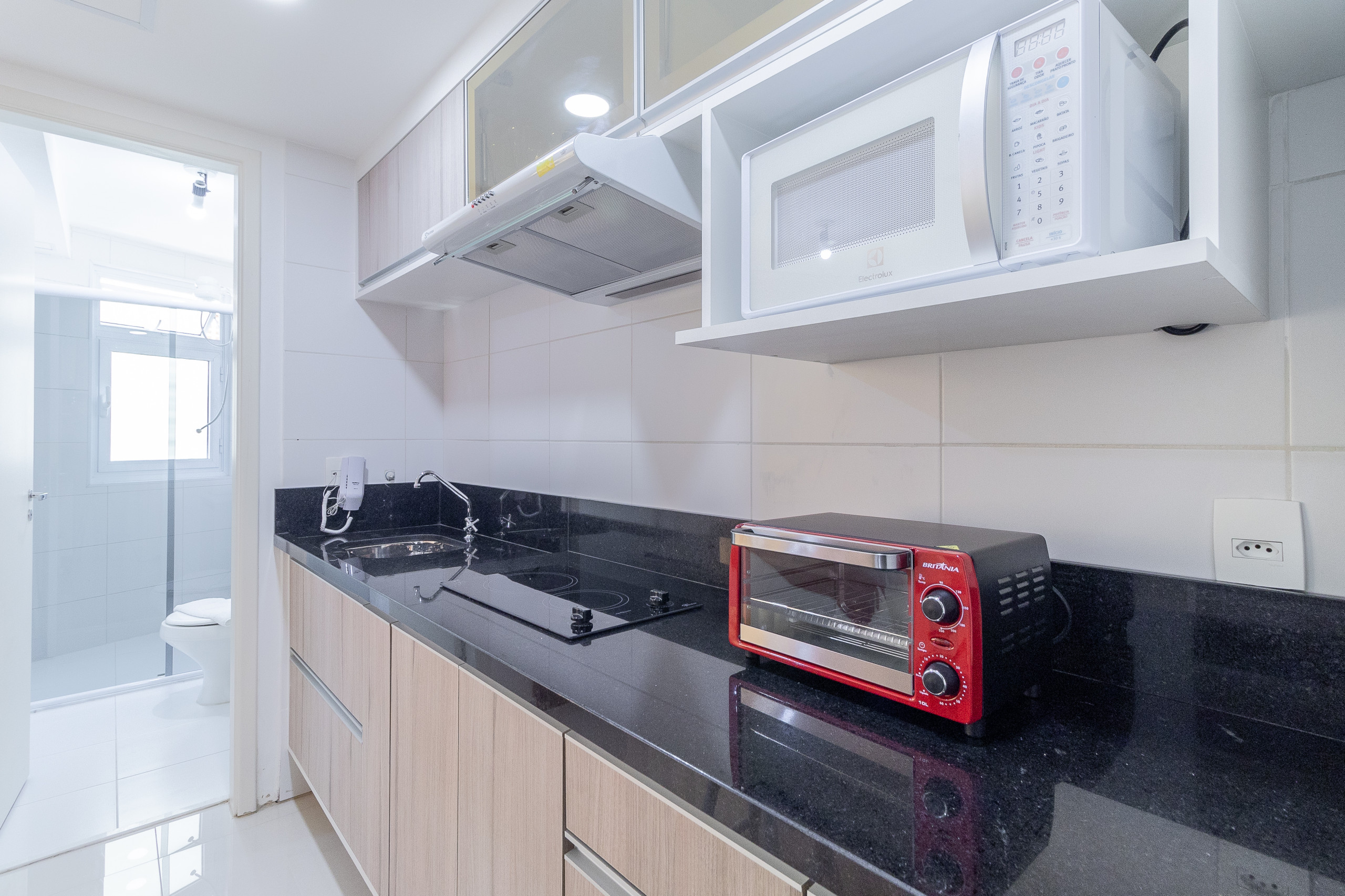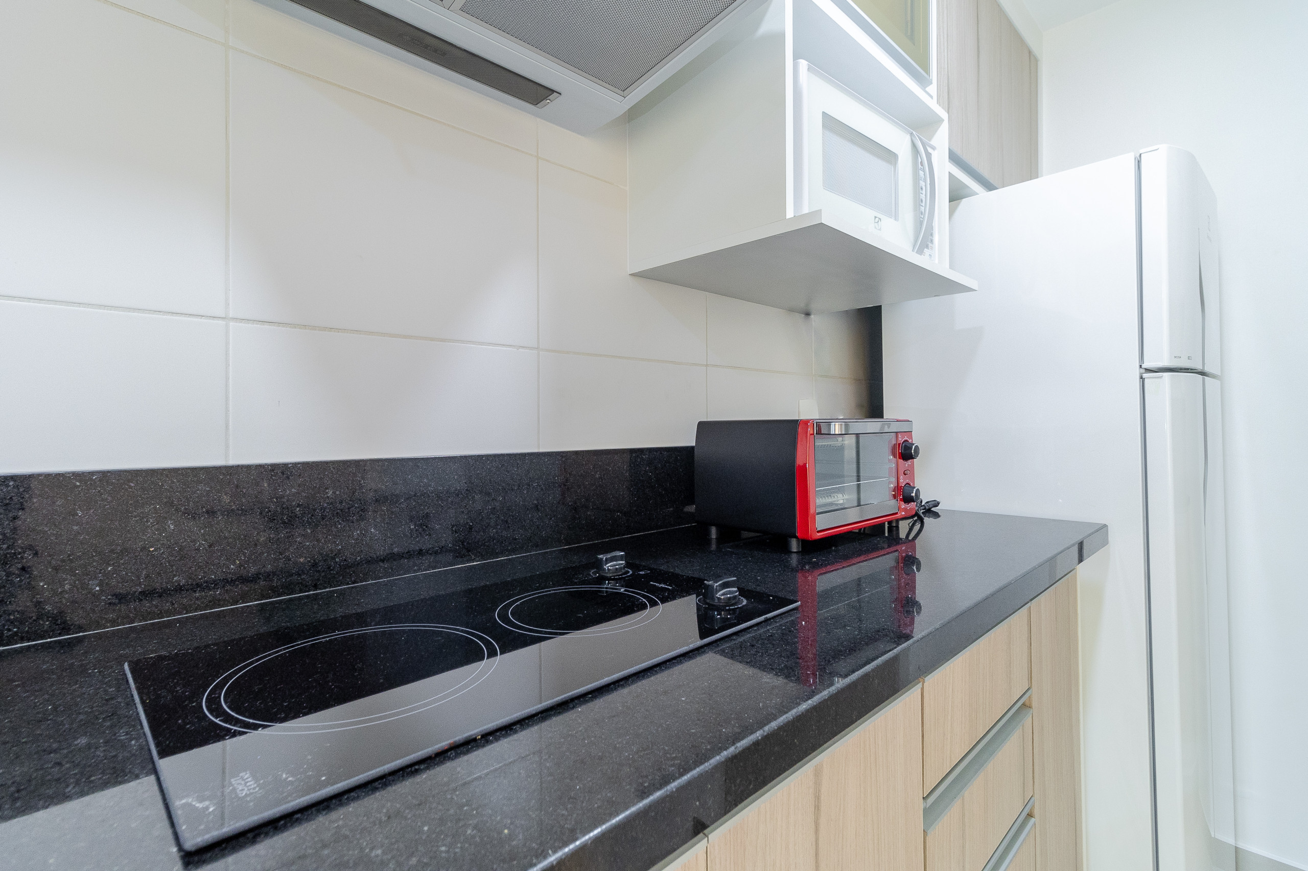 Fogão, refrigerador, cafeteira, micro-ondas, sanduicheira, torradeira e armários.