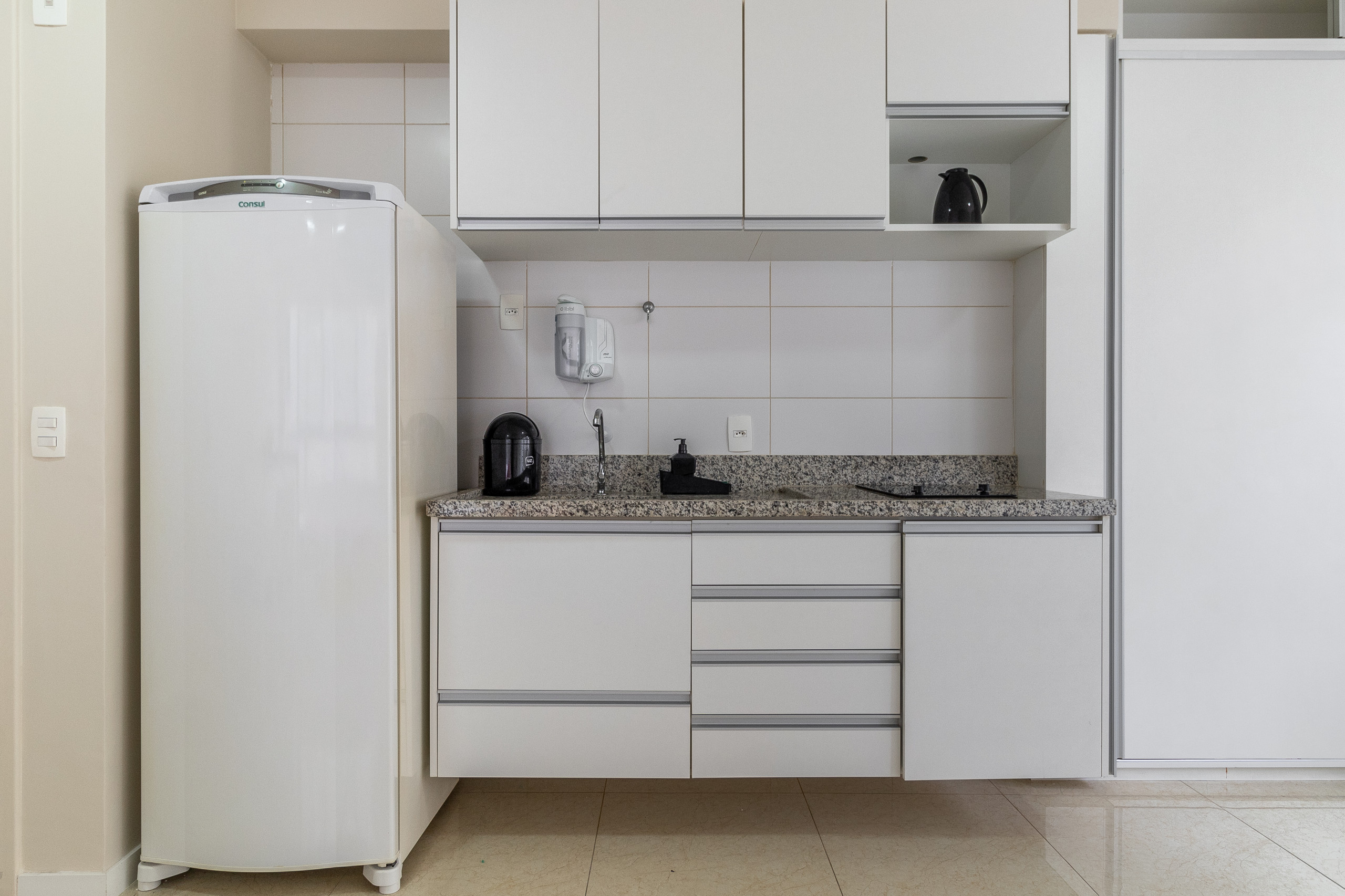 Fogão, refrigerador, cafeteira, micro-ondas, sanduicheira, torradeira e armários.