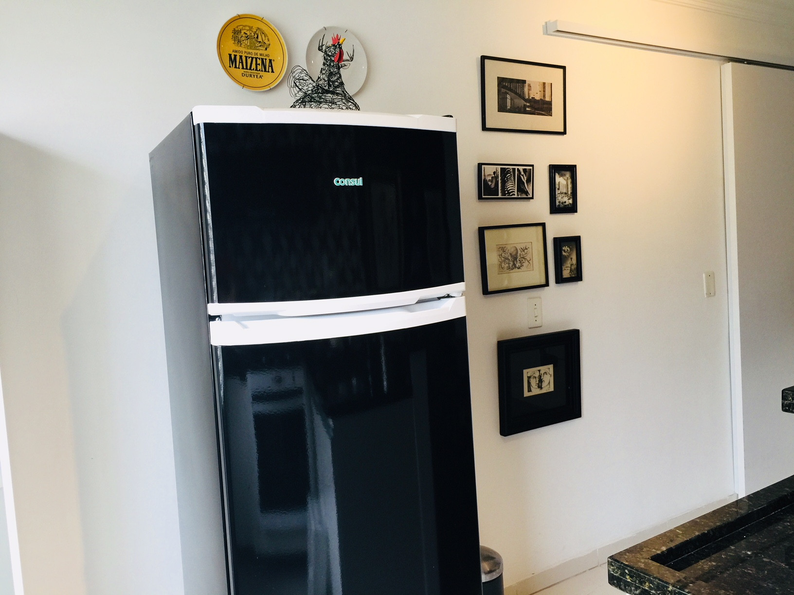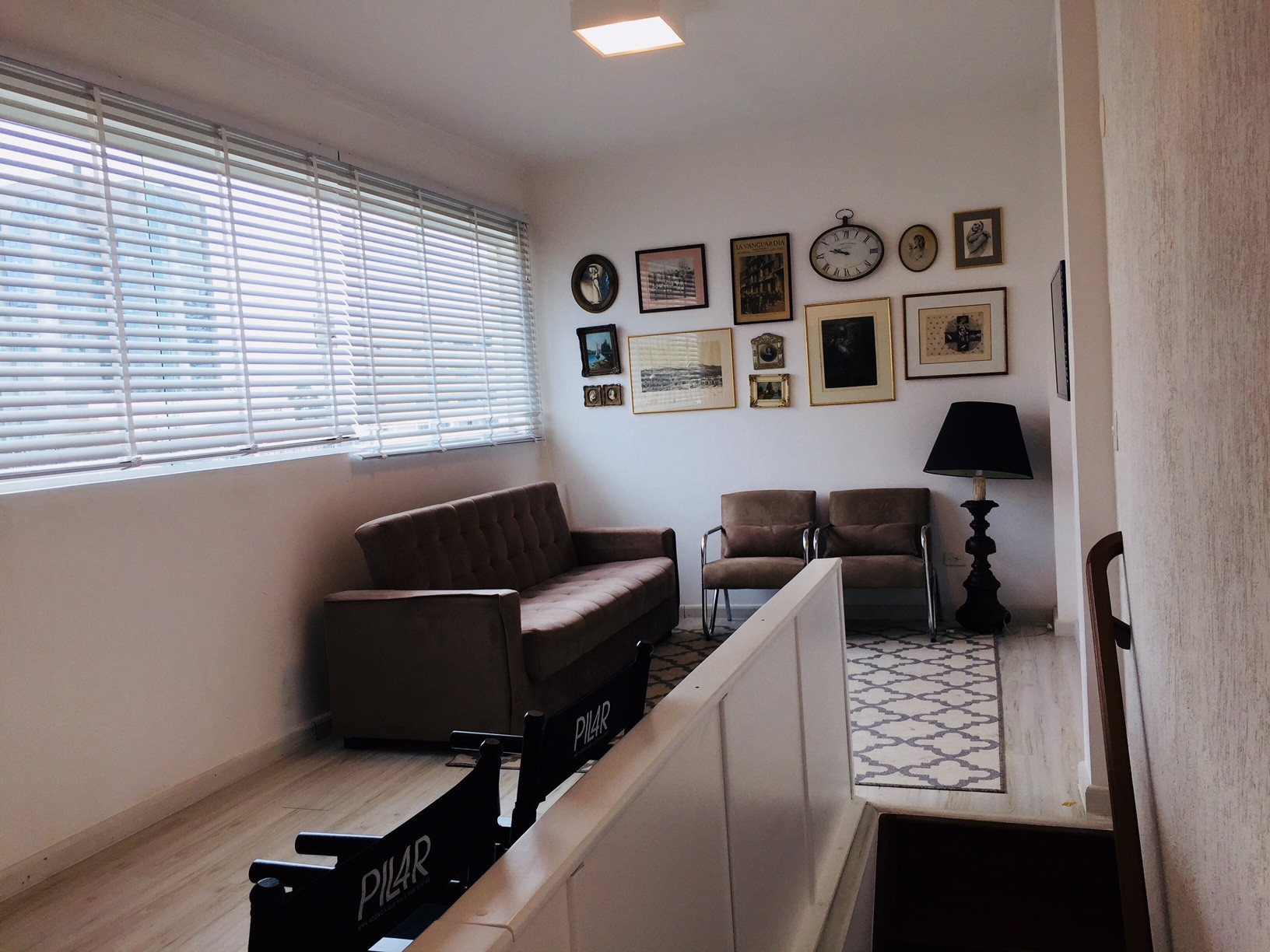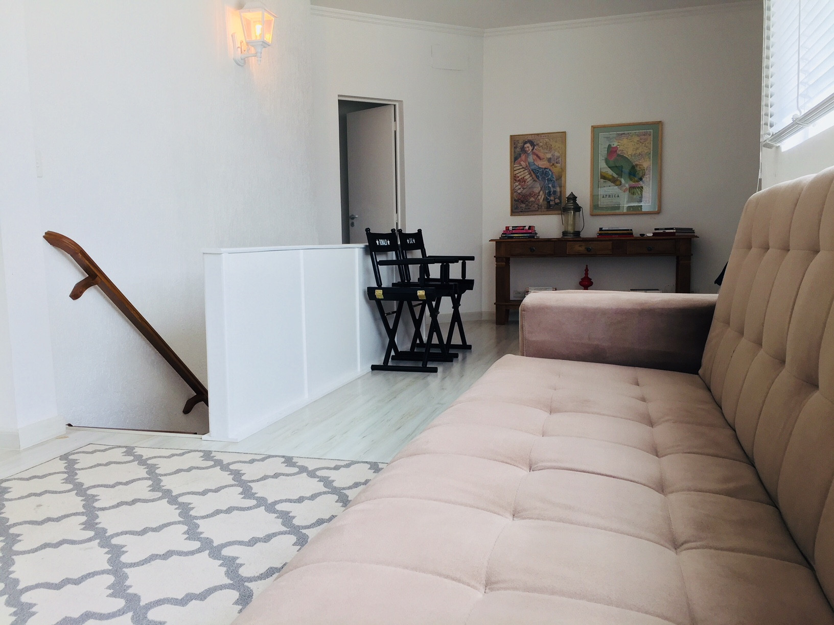 O duplex na Oscar freire possui cozinha americana e uma suite e no primeiro andar. No andar superior, sala de tv, pequeno banheiro e cama de casal.