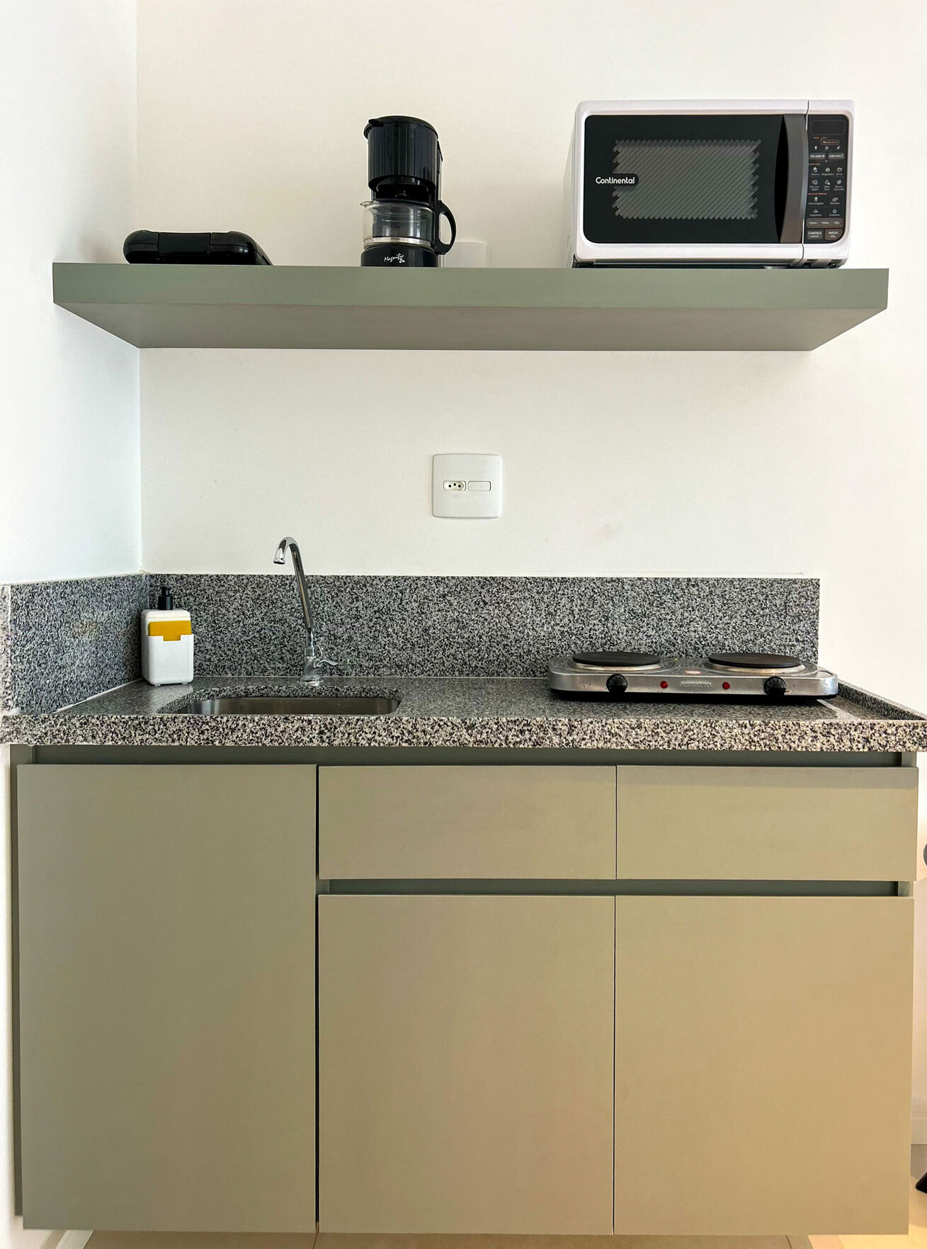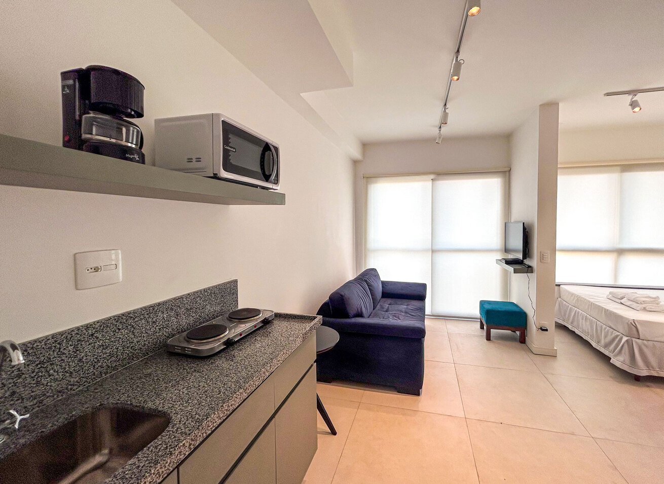 - A cozinha é equipada com todos os utensílios necessários para preparar ótimos pratos, incluindo cafeteira, fogão, geladeira e micro-ondas