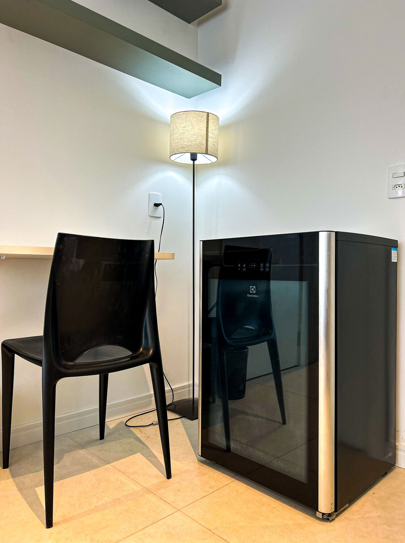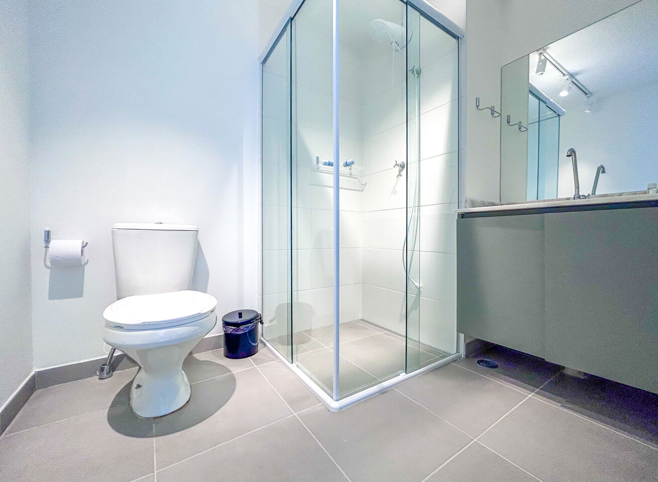 - O banheiro possui chuveiro elétrico, box de vidro/acrílico e secador de cabelo