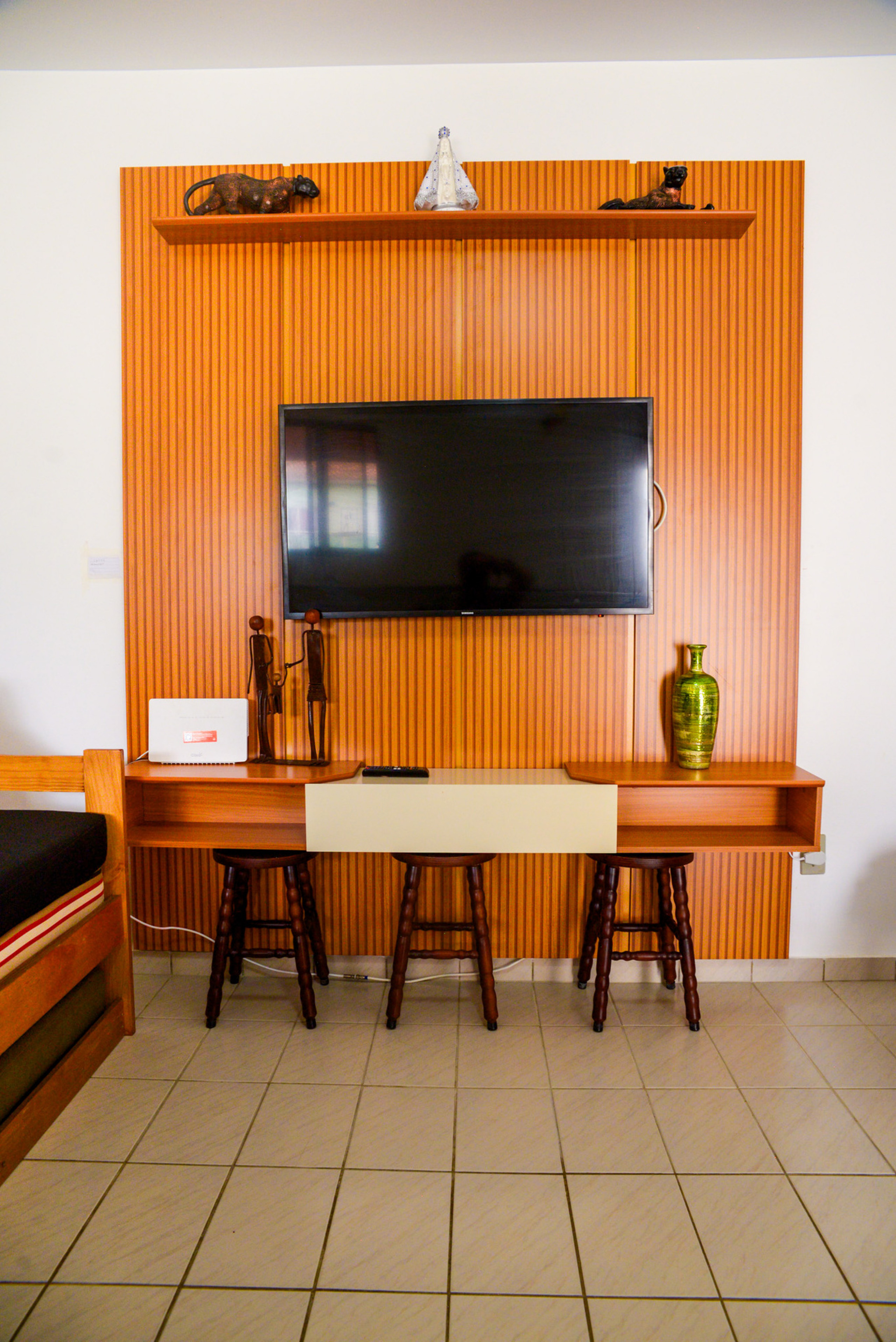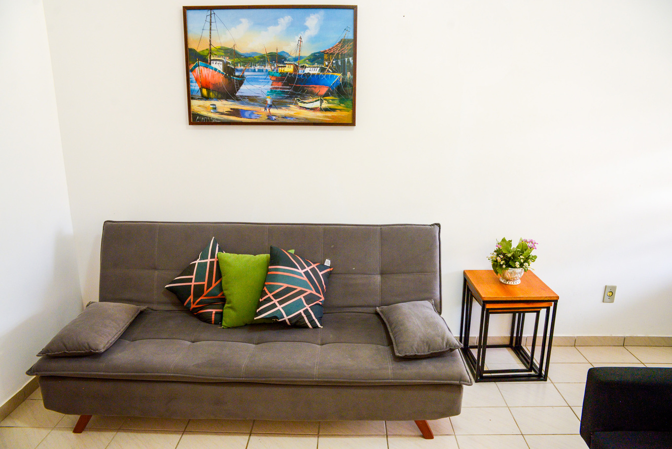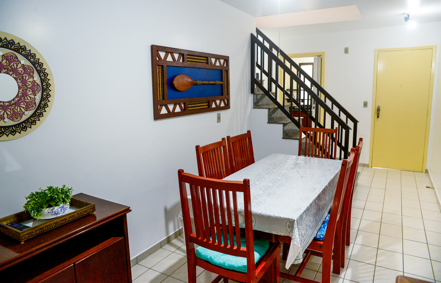 - A sala está equipada com cadeira, mesa de centro, poltrona, sofá de solteiro, sofá-cama de casal, ar-condicionado, ventilador de teto e varanda na sala de jantar (são 2 salas, sendo sala de jantar no andar debaixo e sala de estar em cima)