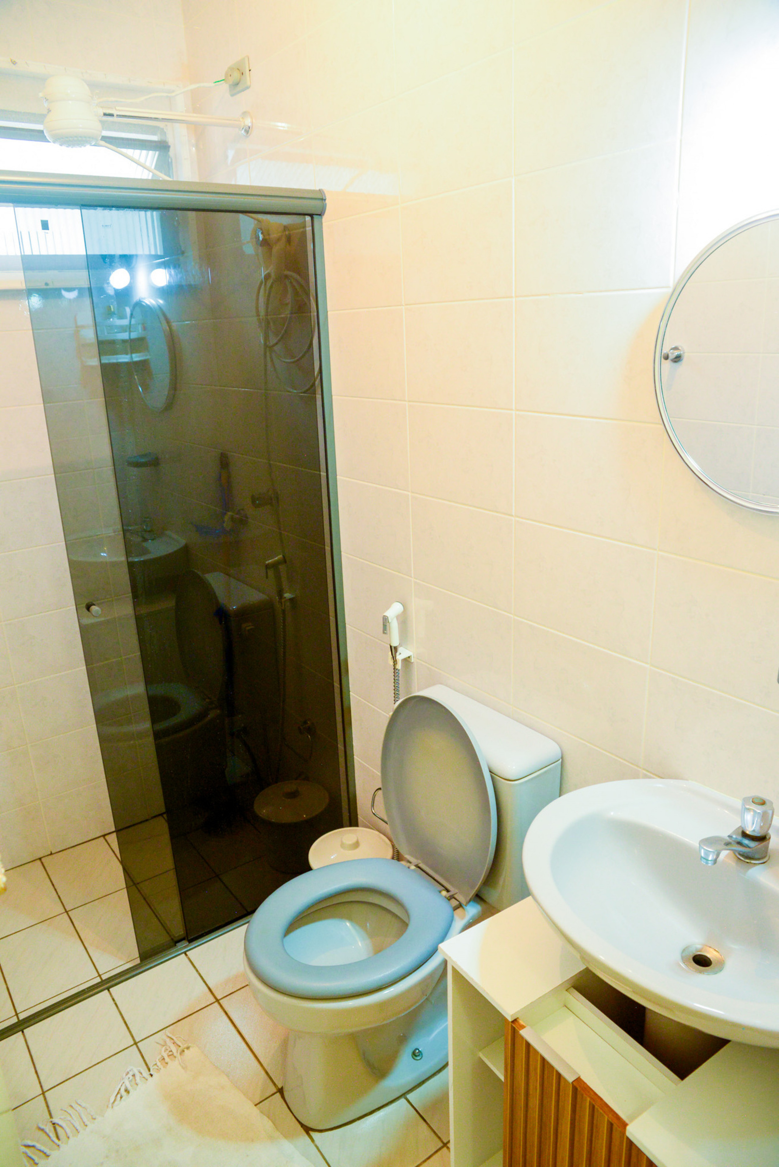 - Os banheiros possuem chuveiro elétrico e box de vidro/acrílico