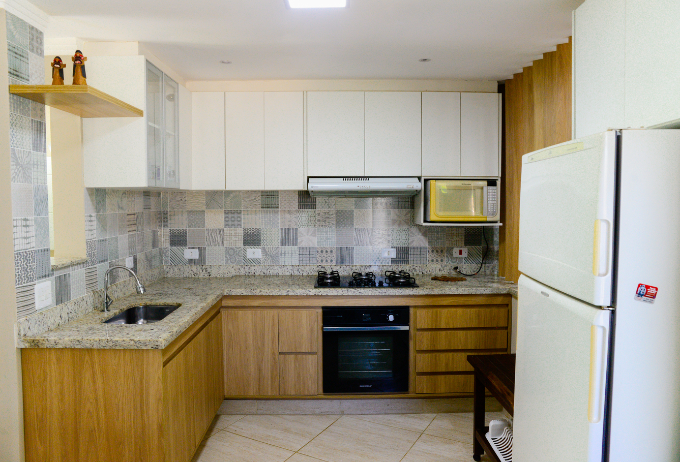 - A cozinha é equipada com diversos utensílios, incluindo fogão, forno, geladeira, liquidificador, filtro de água (necessário comprar o galão) e micro-ondas (exceto sal, pimenta e óleo)