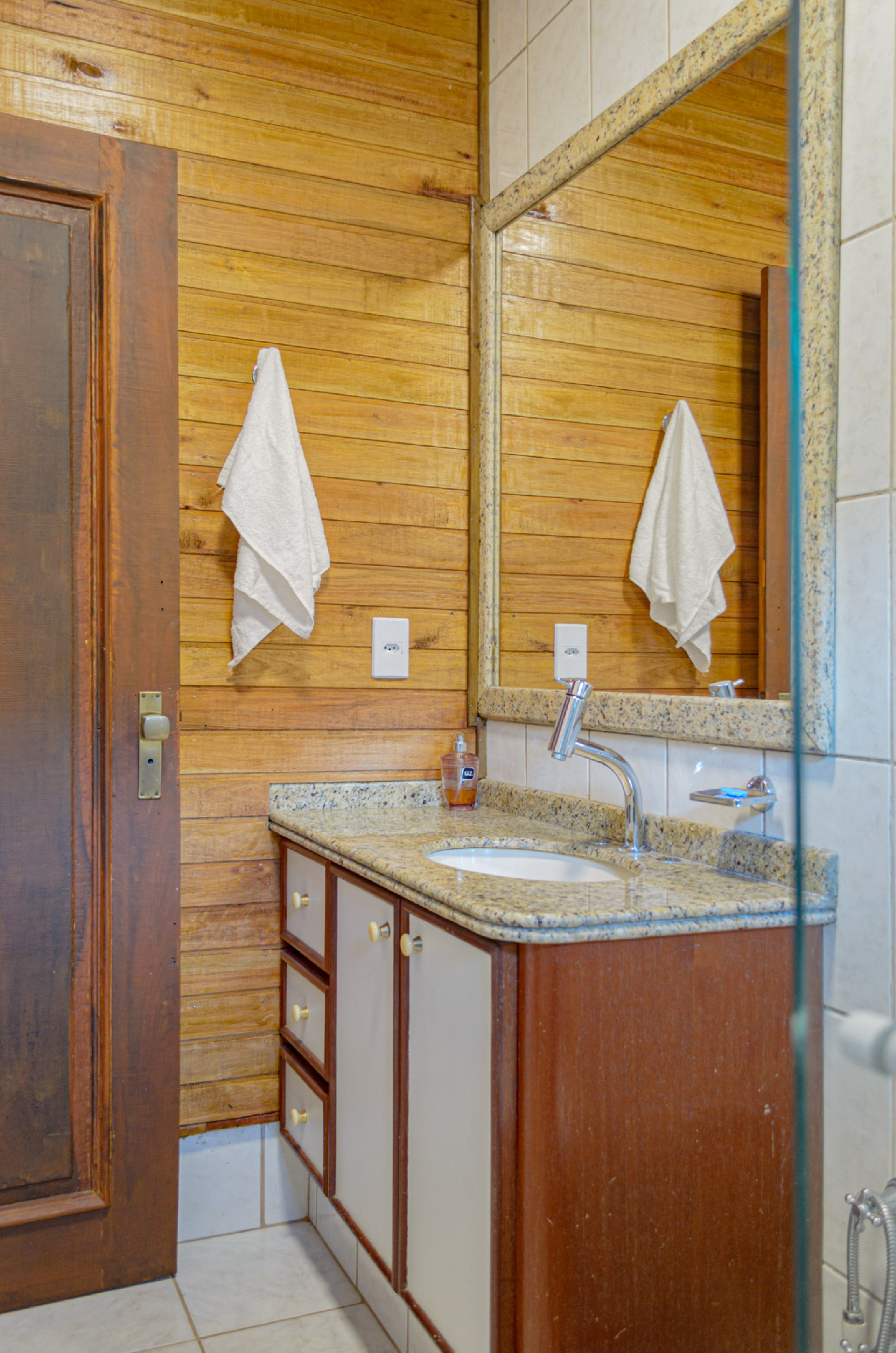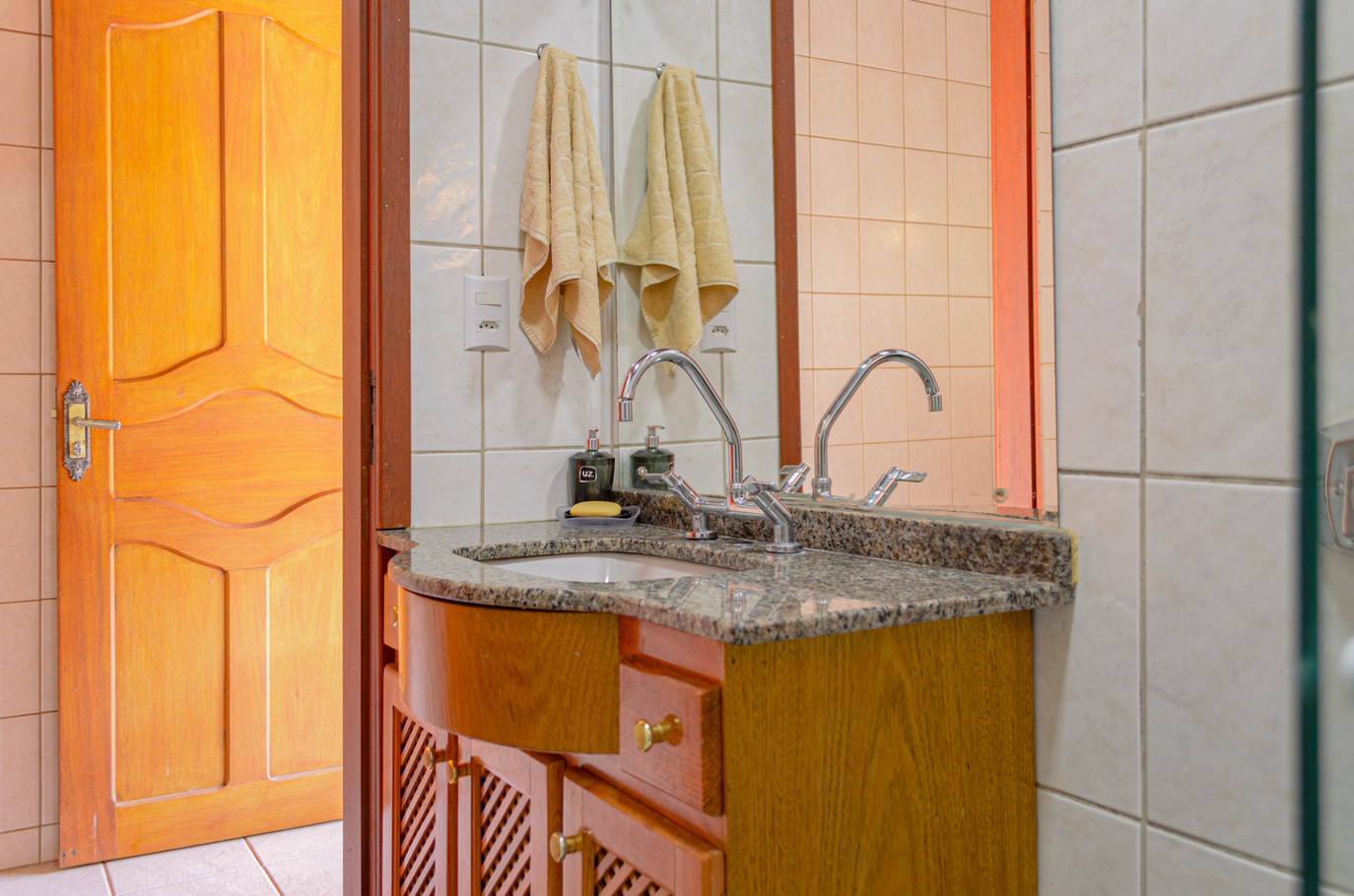 - Banheiro social com chuveiro a gás, box de vidro e secador