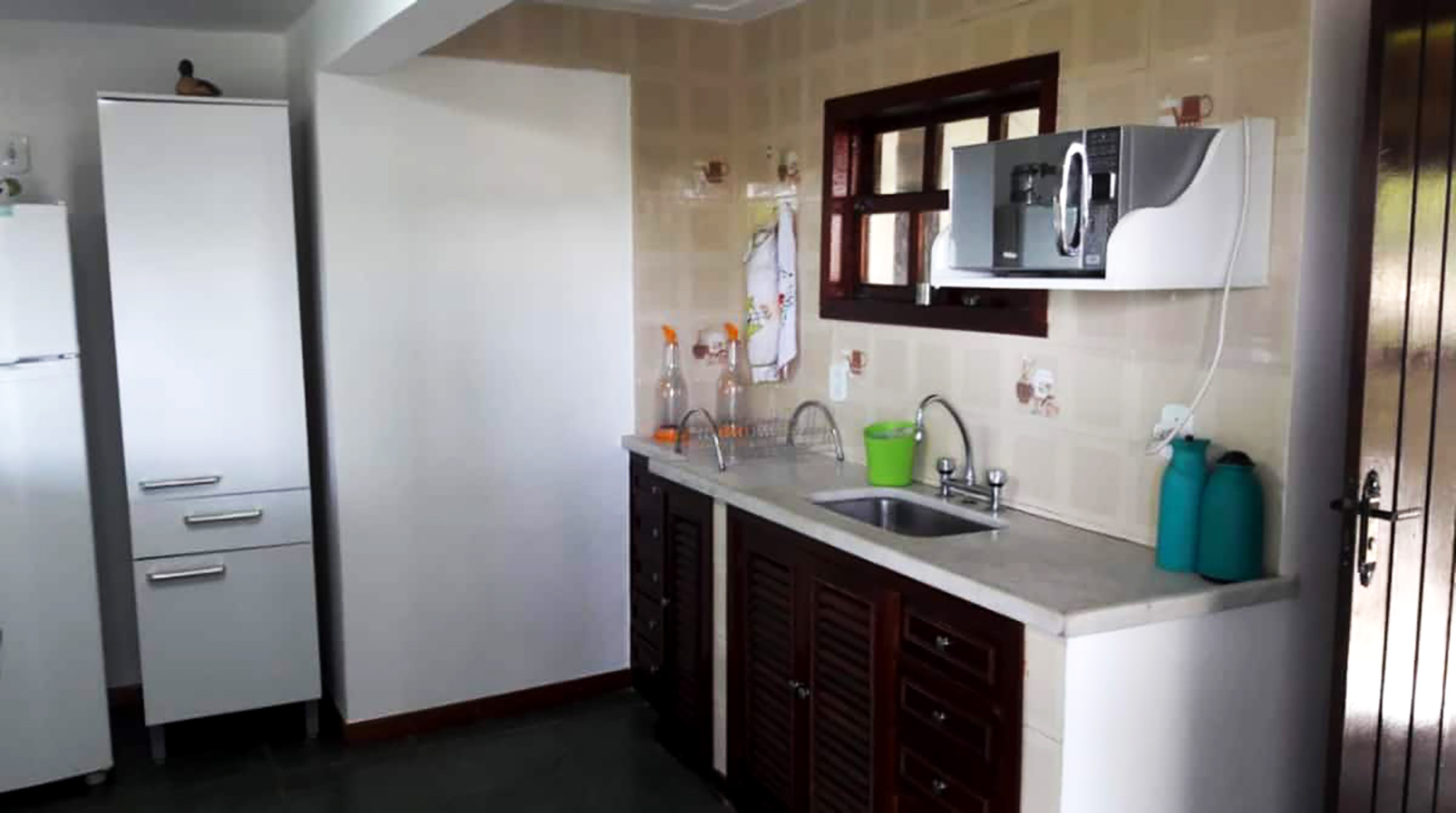 - A cozinha é completa e dispõe de geladeira, fogão, liquidificador, torradeira, cafeteira e diversos utensílios