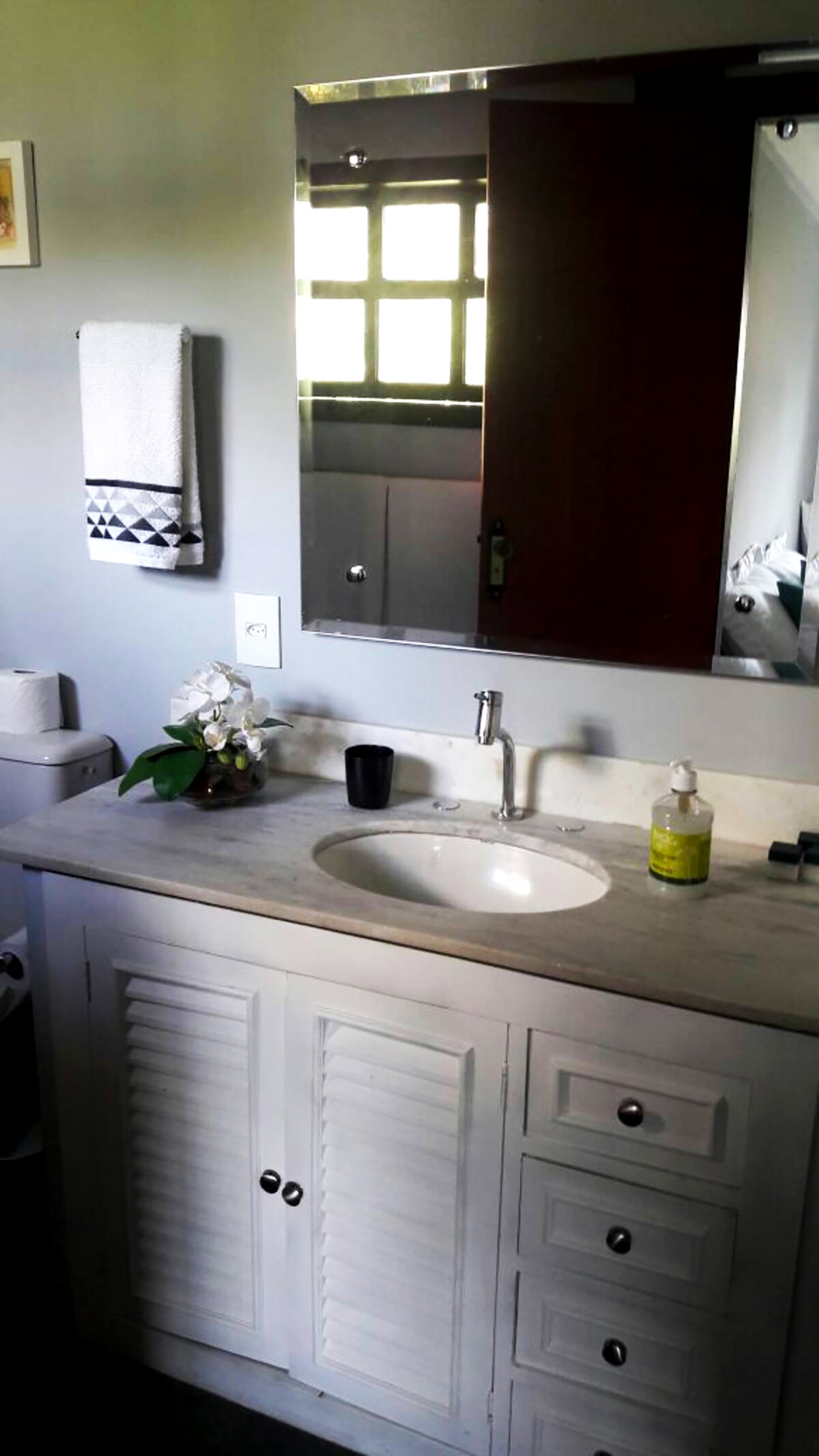 - Os banheiros têm chuveiro elétrico, box de vidro/acrílico e espelho