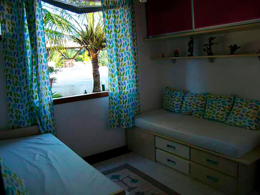 - Na suíte 4 há 1 bicama e 1 cama de solteiro com vista para a piscina