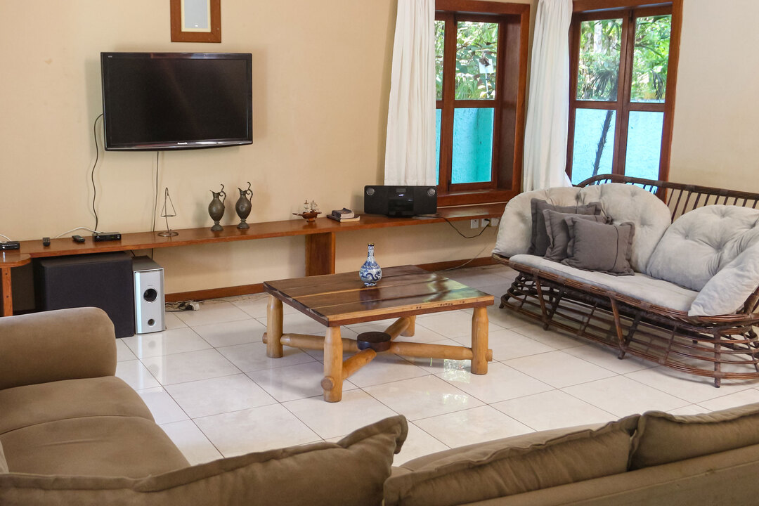 - Na sala você encontra mesa de centro, sofá e TV a cabo