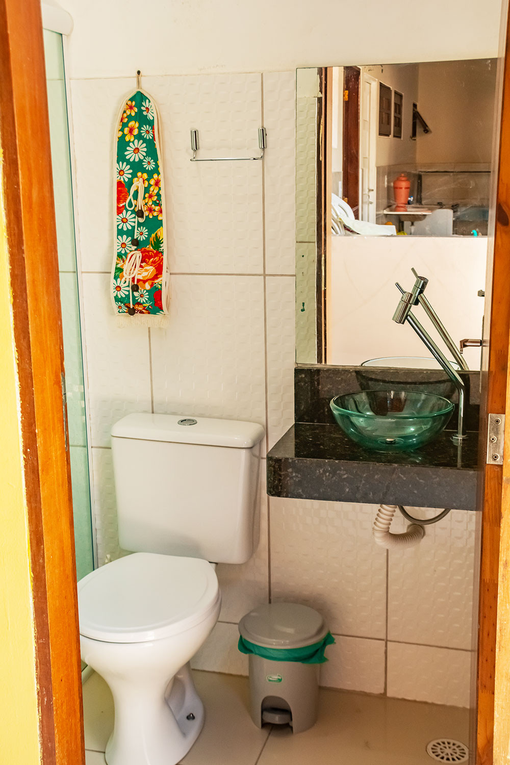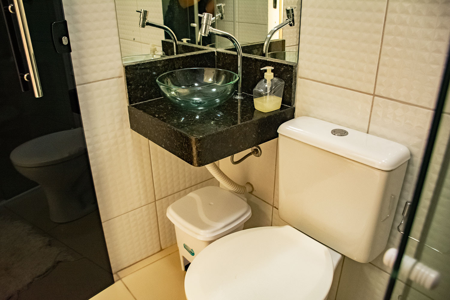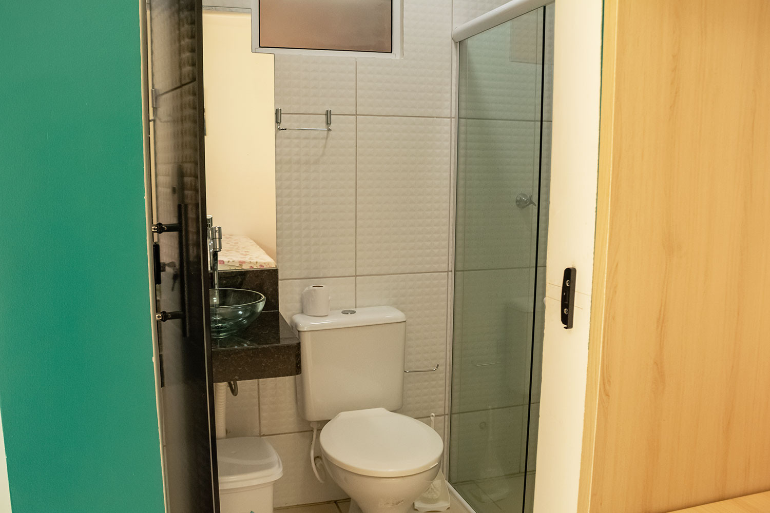 - Os banheiros dispõem de chuveiro elétrico, box de vidro, armário e espelho, além de um secador de cabelo disponível para uso de todos os hóspedes