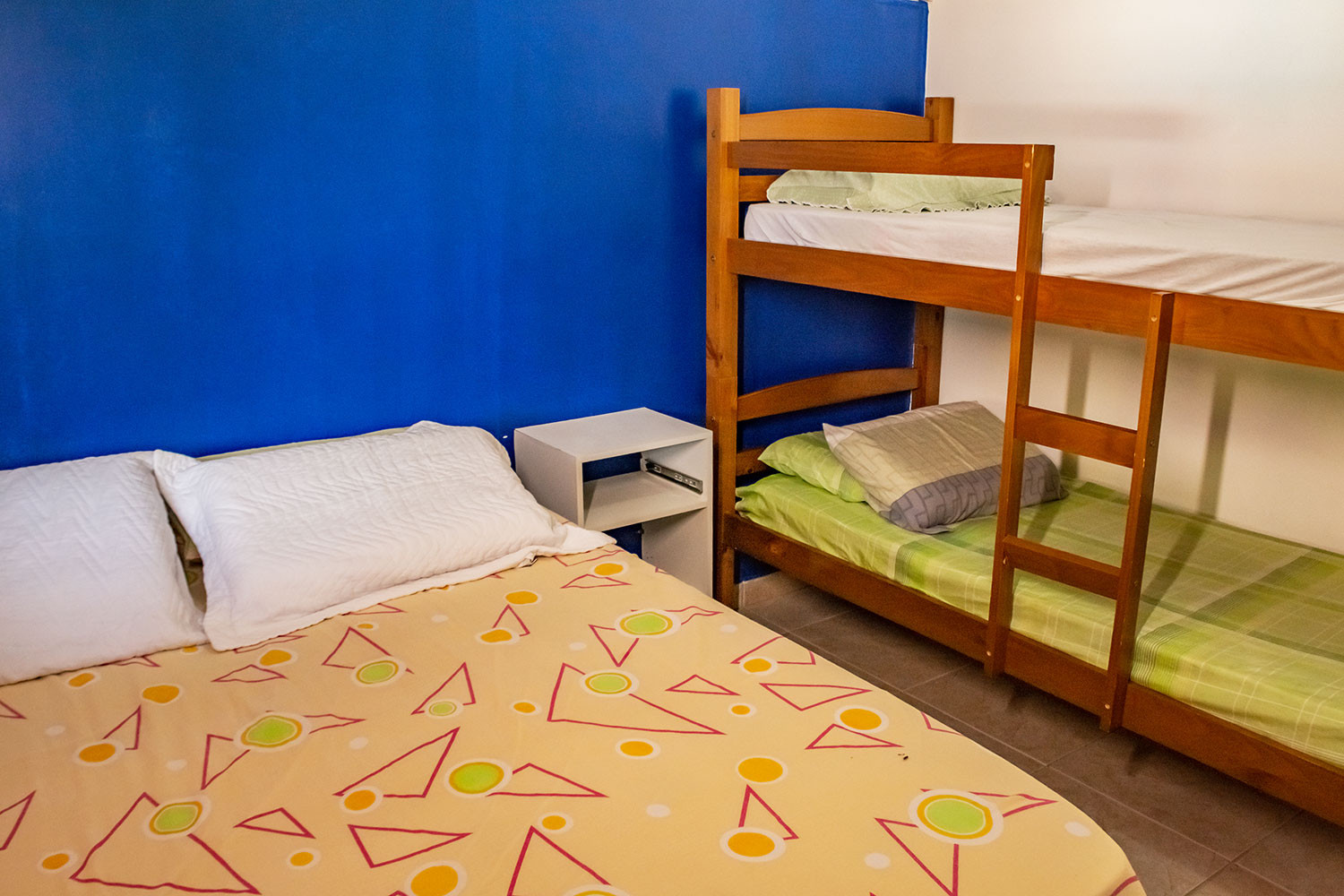 - As duas suítes externas anexas à casa estão equipadas assim: na primeira tem uma cama king size, uma cama de solteiro e uma beliche (essa fica no térreo), e no segundo quarto há uma cama de casal e duas camas de solteiro (essa fica no primeiro andar da propriedade)