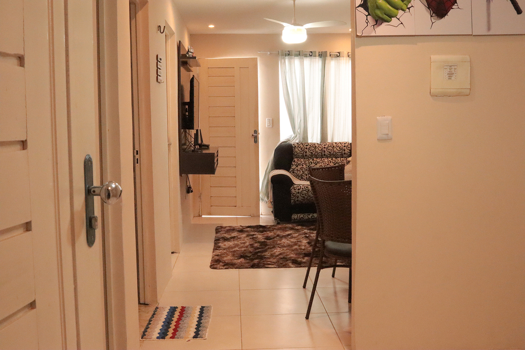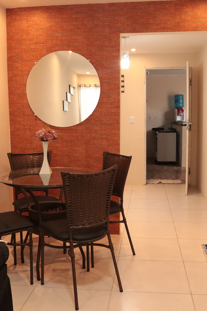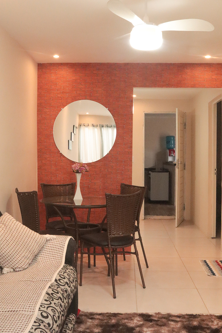 - Na sala você encontra cadeira, mesa de centro, sofá, smart tv e ventilador de teto