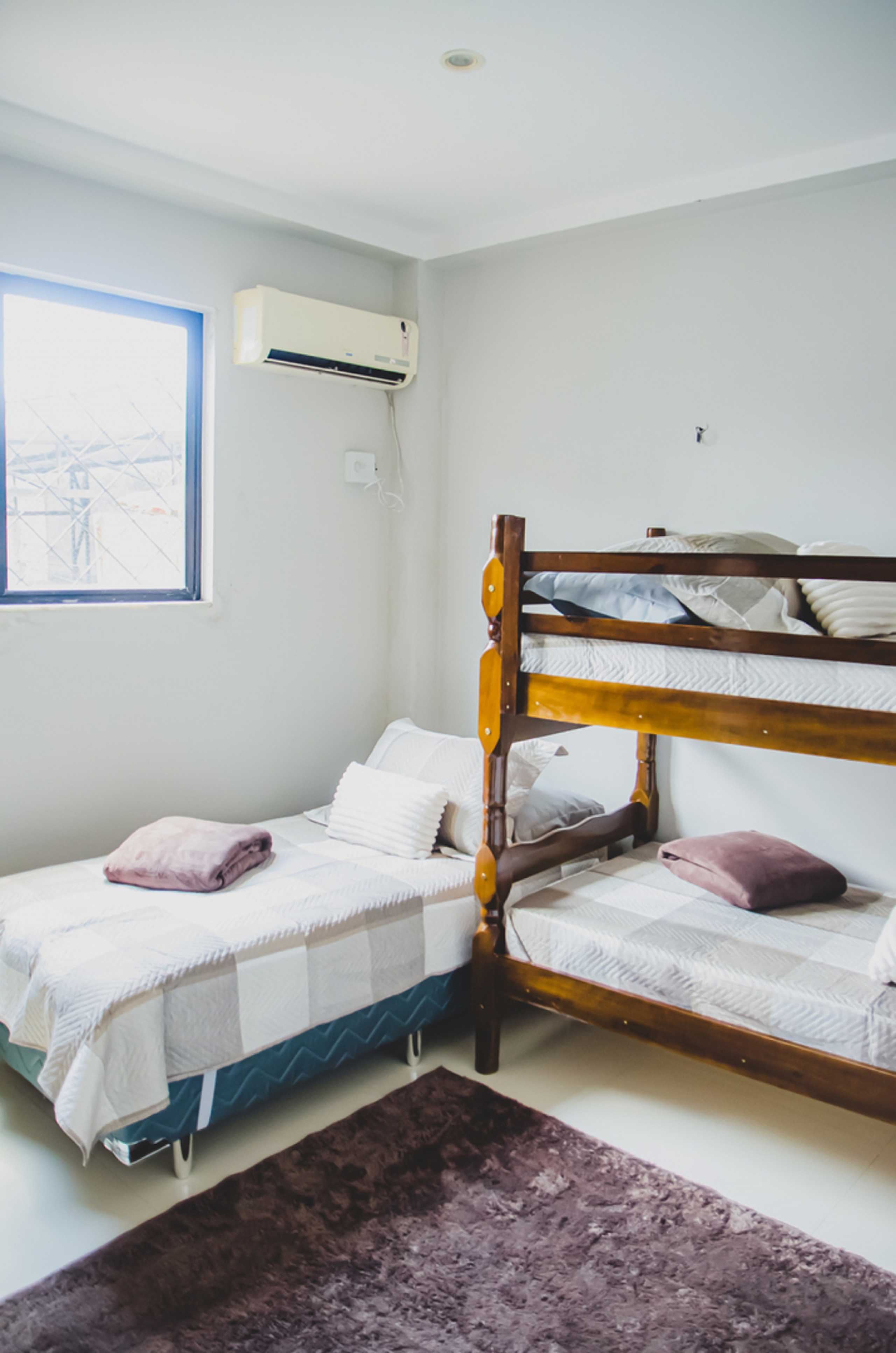 - Quarto 2 (suíte): 1 beliche, 1 cama de solteiro, ar-condicionado, armário e banheiro privativo com chuveiro elétrico e box de vidro/acrílico