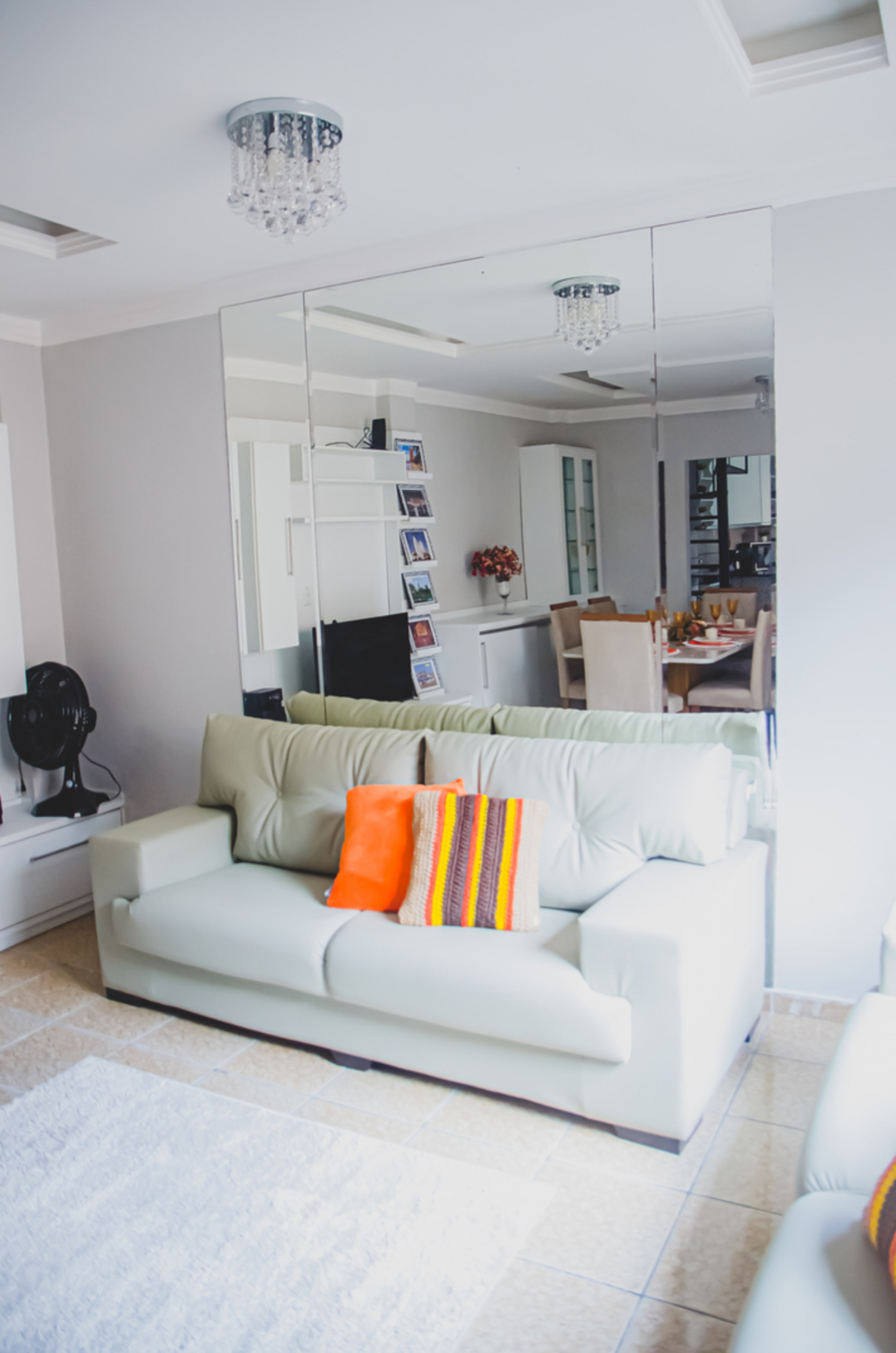 - Sala com sofá, mesa de jantar, smart TV e sistema de som