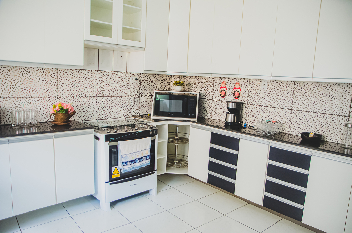 - Cozinha equipada com fogão, forno, microondas, cafeteira, geladeira, balcão, mesa e utensílios completos(exceto óleo e sal)