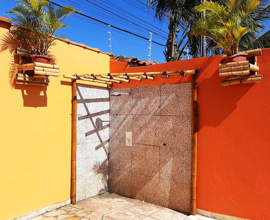 Linda casa de veraneio com lazer e conforto. Aproveite para relaxar e se divertir na área da piscina, que oferece iluminação, ducha externa e mesas, cadeiras e guarda-sóis.