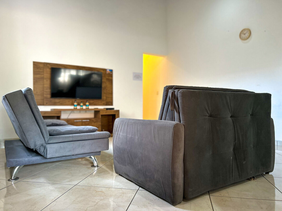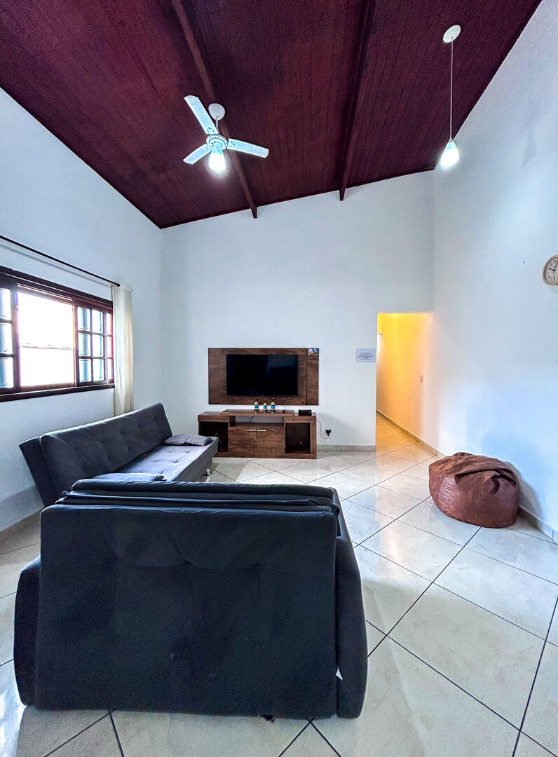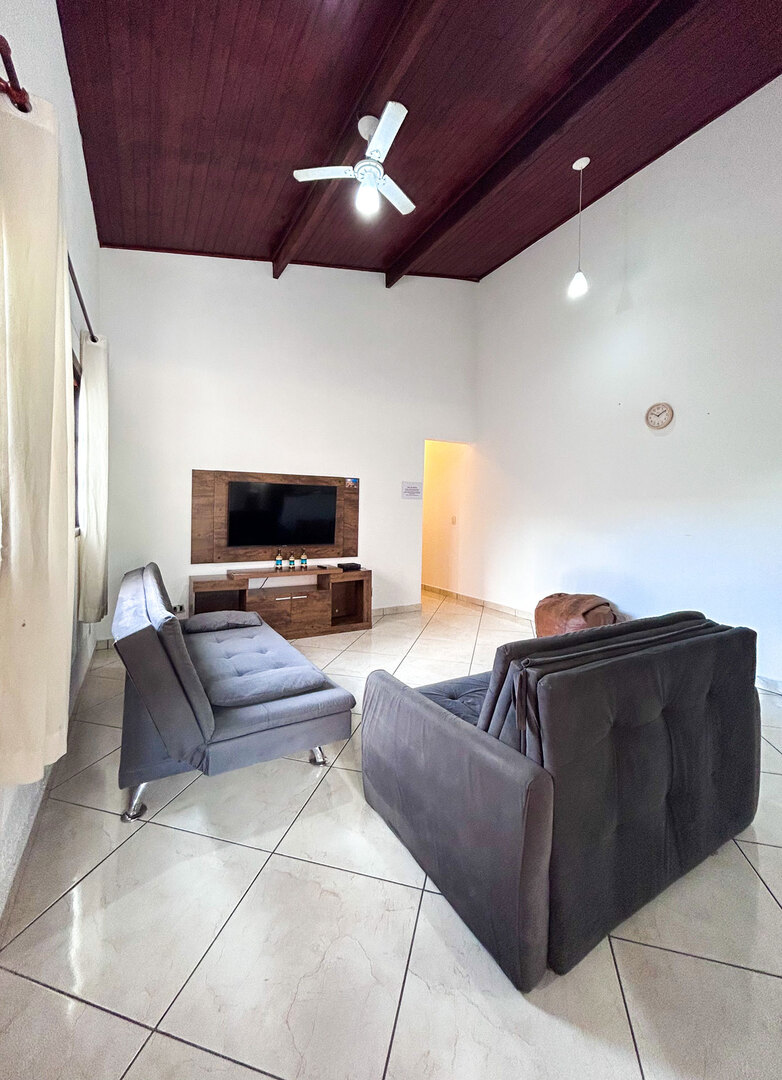 - A sala está equipada com sofá-cama e ventilador de teto