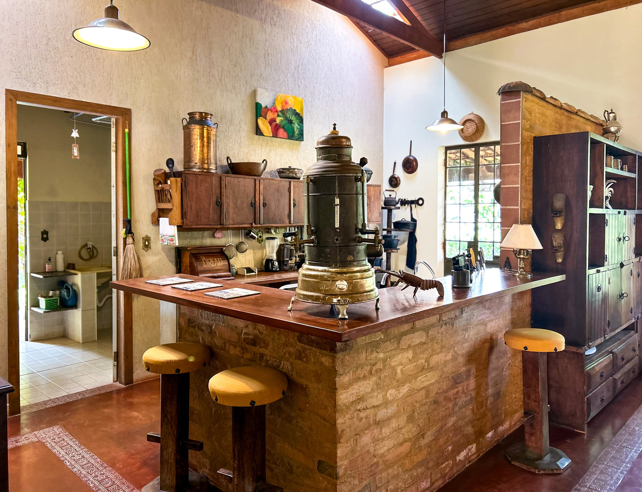 - A cozinha é equipada com diversos utensílios, incluindo cafeteira, fogão, forno, geladeira, liquidificador e micro-ondas