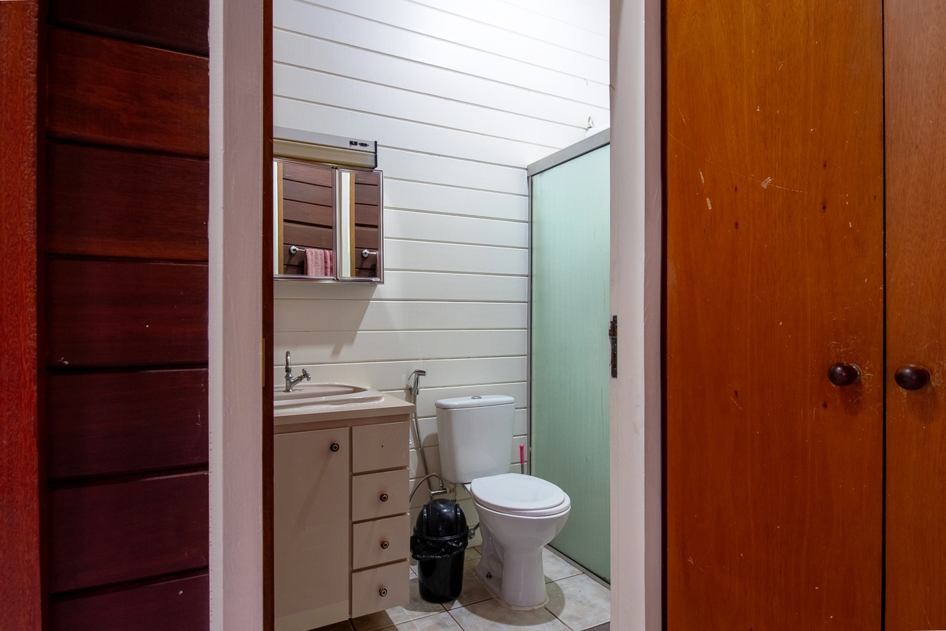 - Nos banheiros externos há chuveiro elétrico e box de acrílico