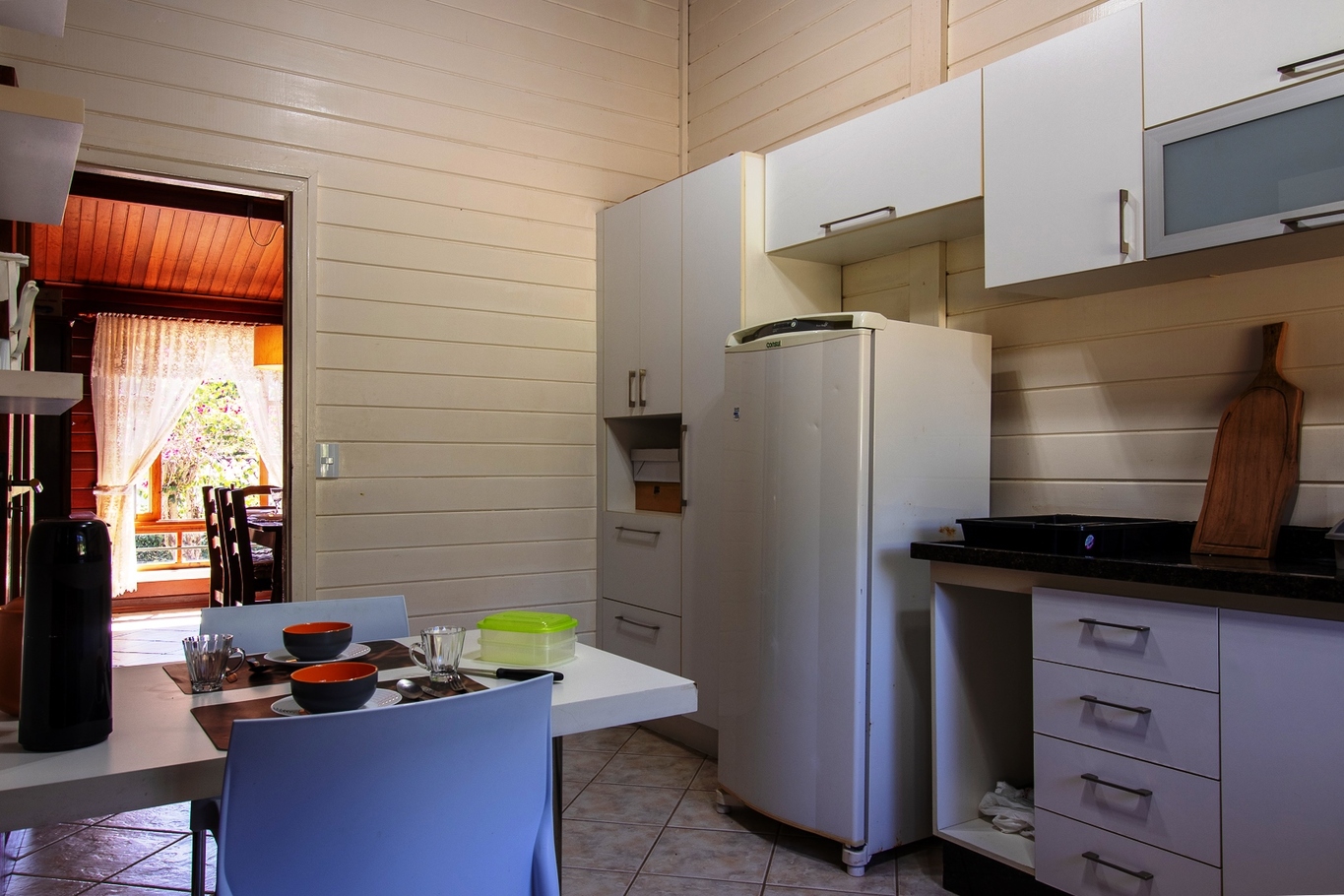 - A cozinha é equipada com diversos utensílios, incluindo freezer, fogão, forno, geladeira, liquidificador e micro-ondas