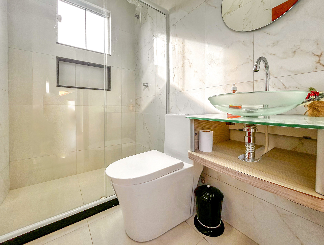 - Os banheiros têm chuveiro elétrico, box de vidro/acrílico e secador de cabelo
