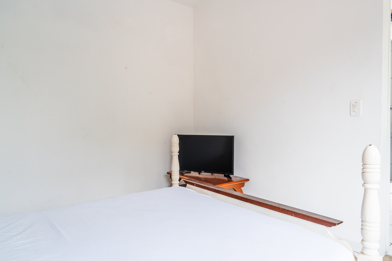 - No quarto há 1 cama de casal, guarda-roupa, ventilador de teto, cortina blackout, mesa de cabeceira e abajur