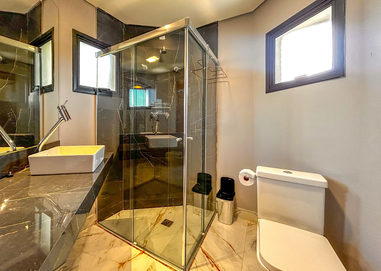 - Na suíte 4 há 1 cama queen size e 1 cama de solteiro, aquecimento, armário, edredom/cobertor, varanda e banheiro privativo com chuveiro a gás e box de vidro/acrílico