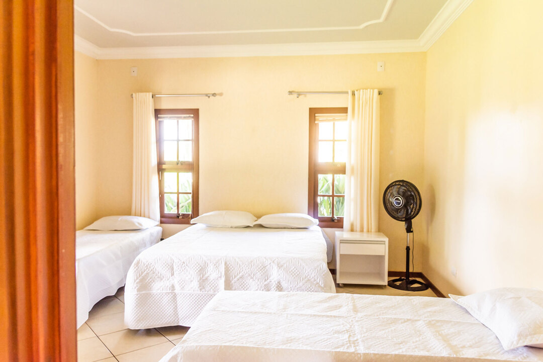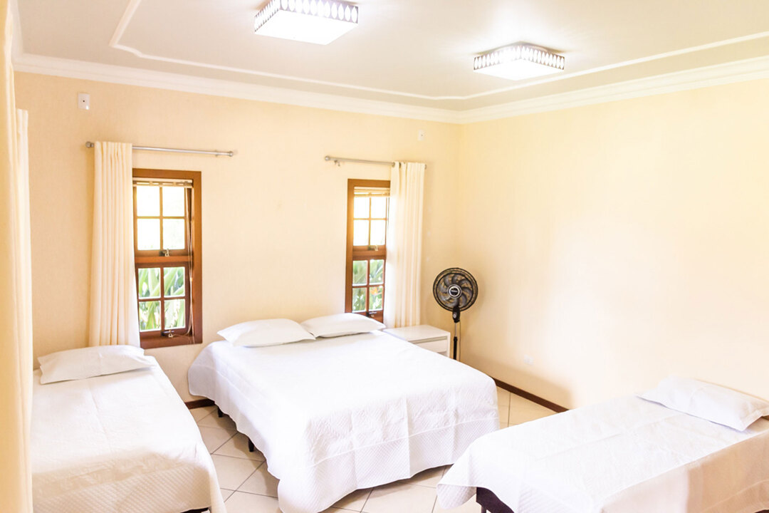 - No quarto 4 há 1 cama queen size, 2 camas de solteiro e 2 colchões extras de solteiro