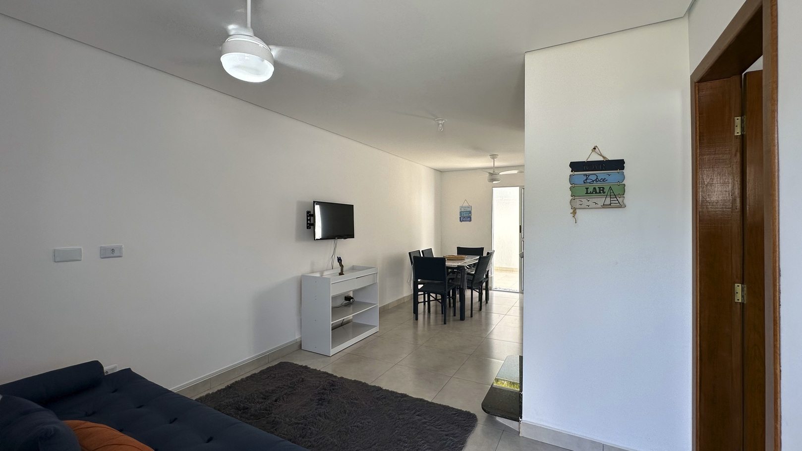 - A sala está equipada com cadeira, sofá-cama e ventilador de teto