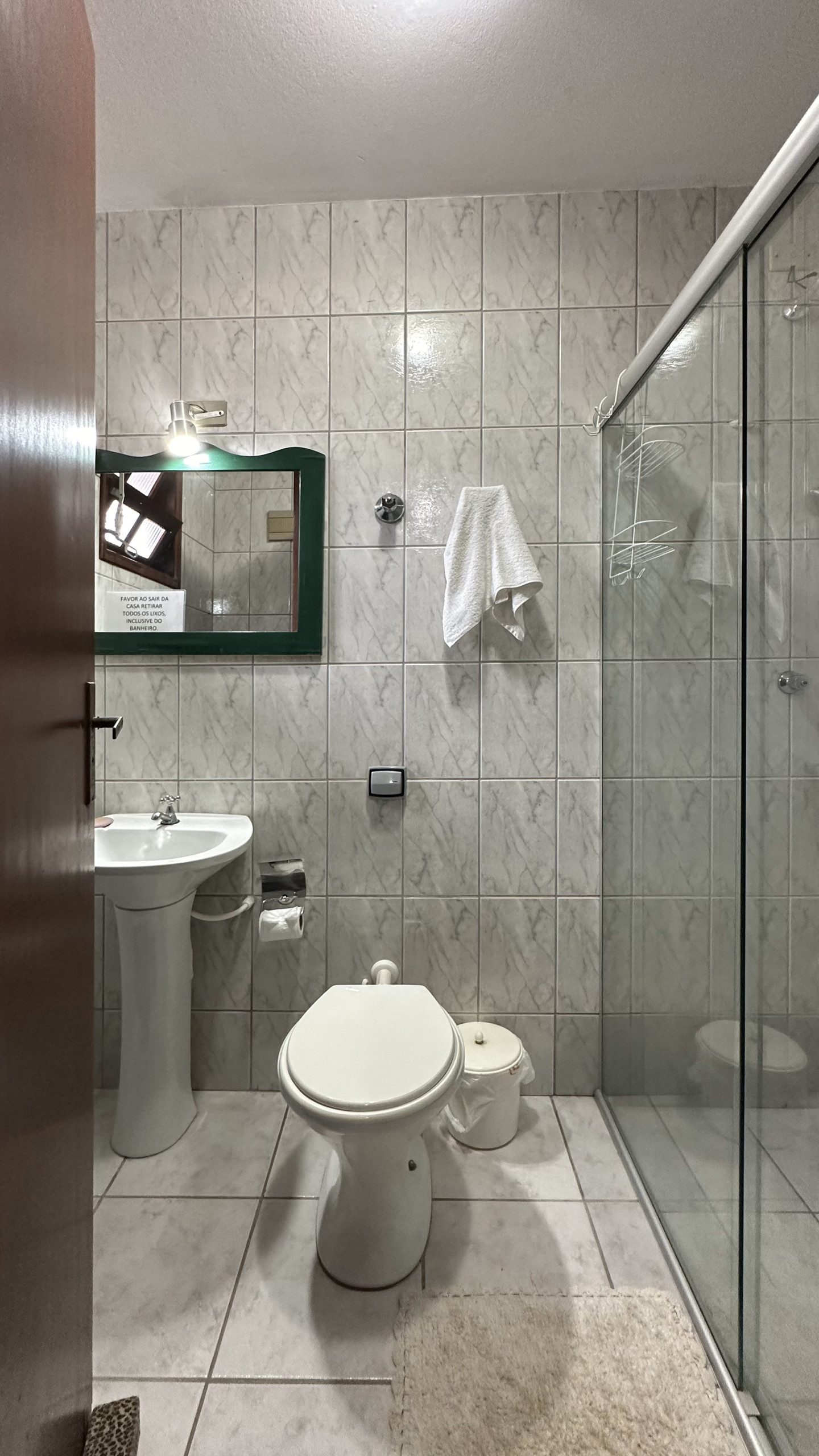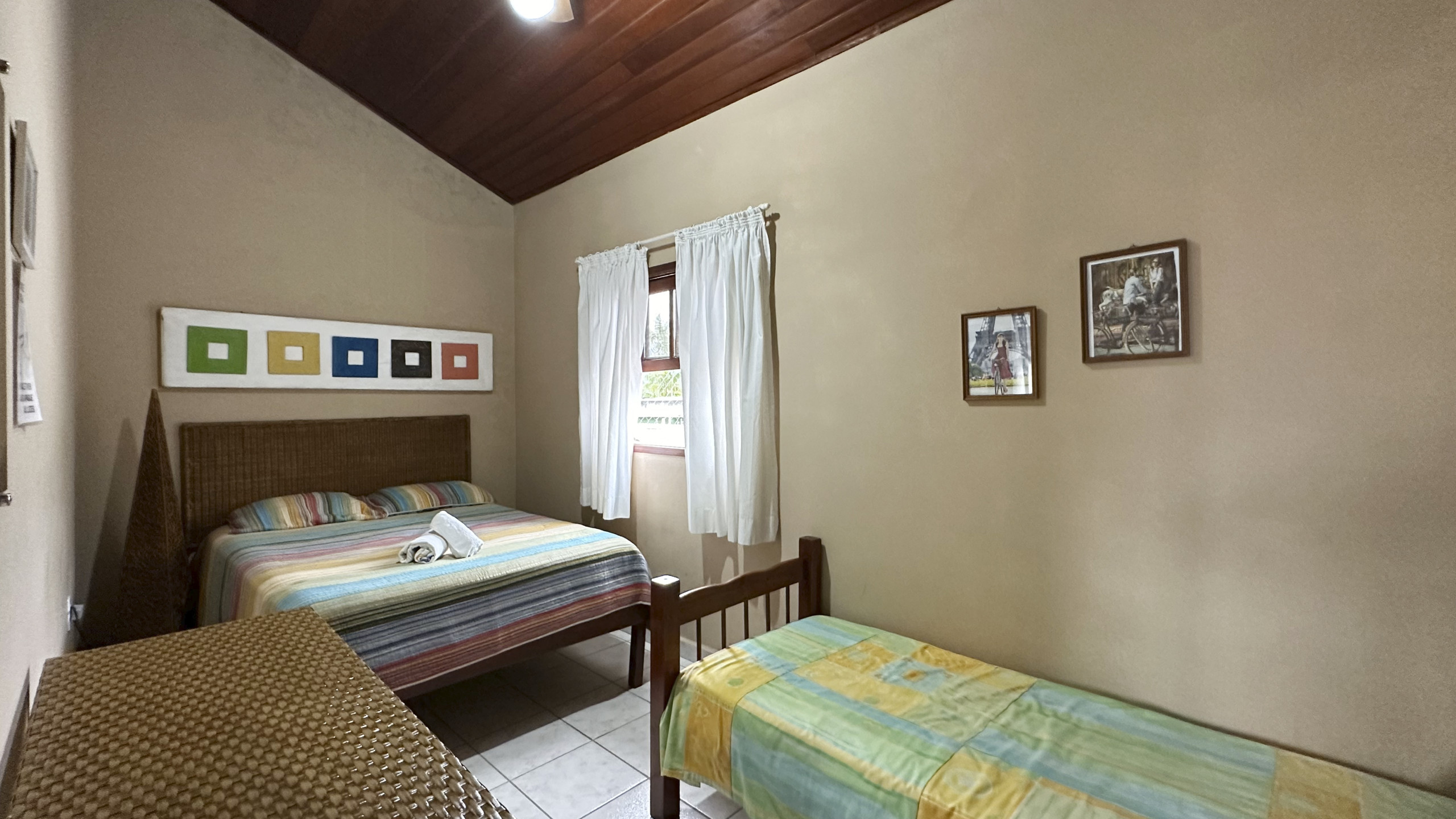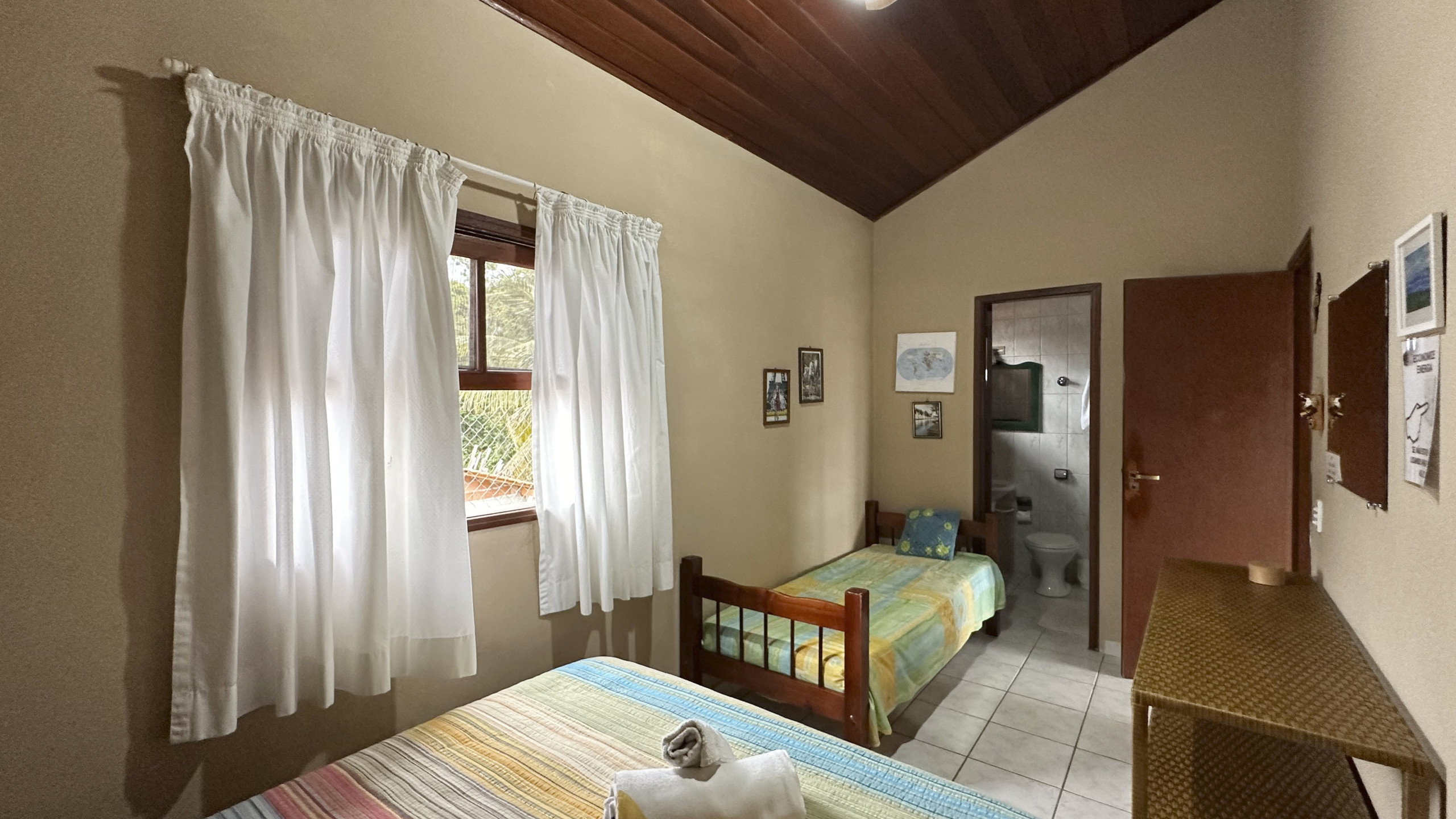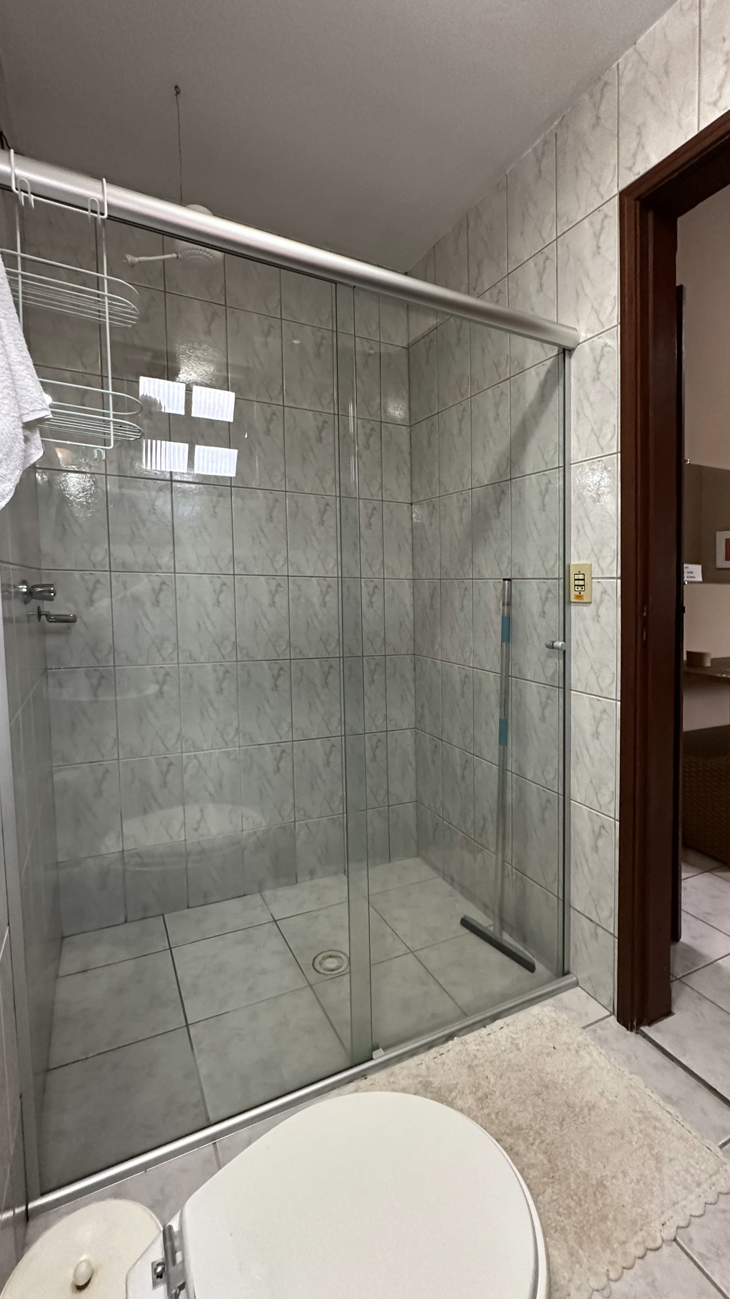 - Suíte com 1 cama de solteiro, 1 cama de casal, chuveiro elétrico, box de vidro e secador de cabelo