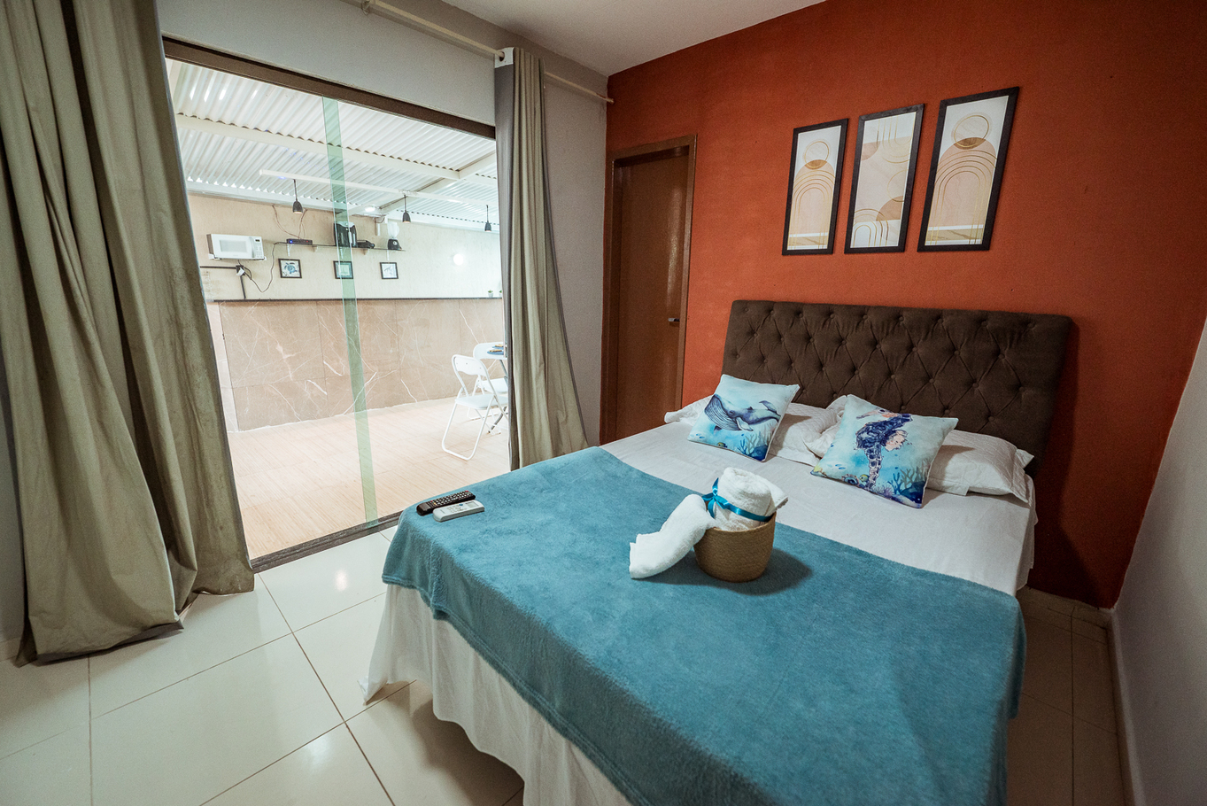 - Quarto 1 (suíte): cama de casal, ar-condicionado, Smart TV e banheiro com box de vidro