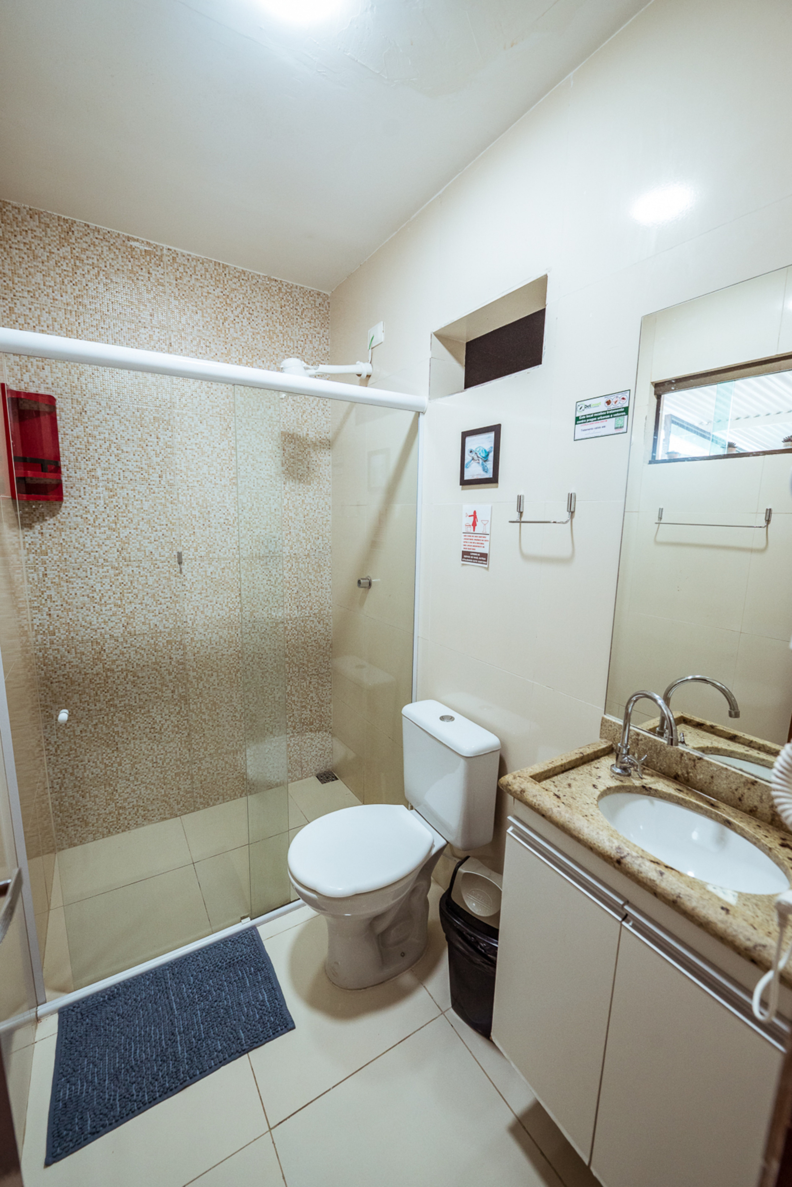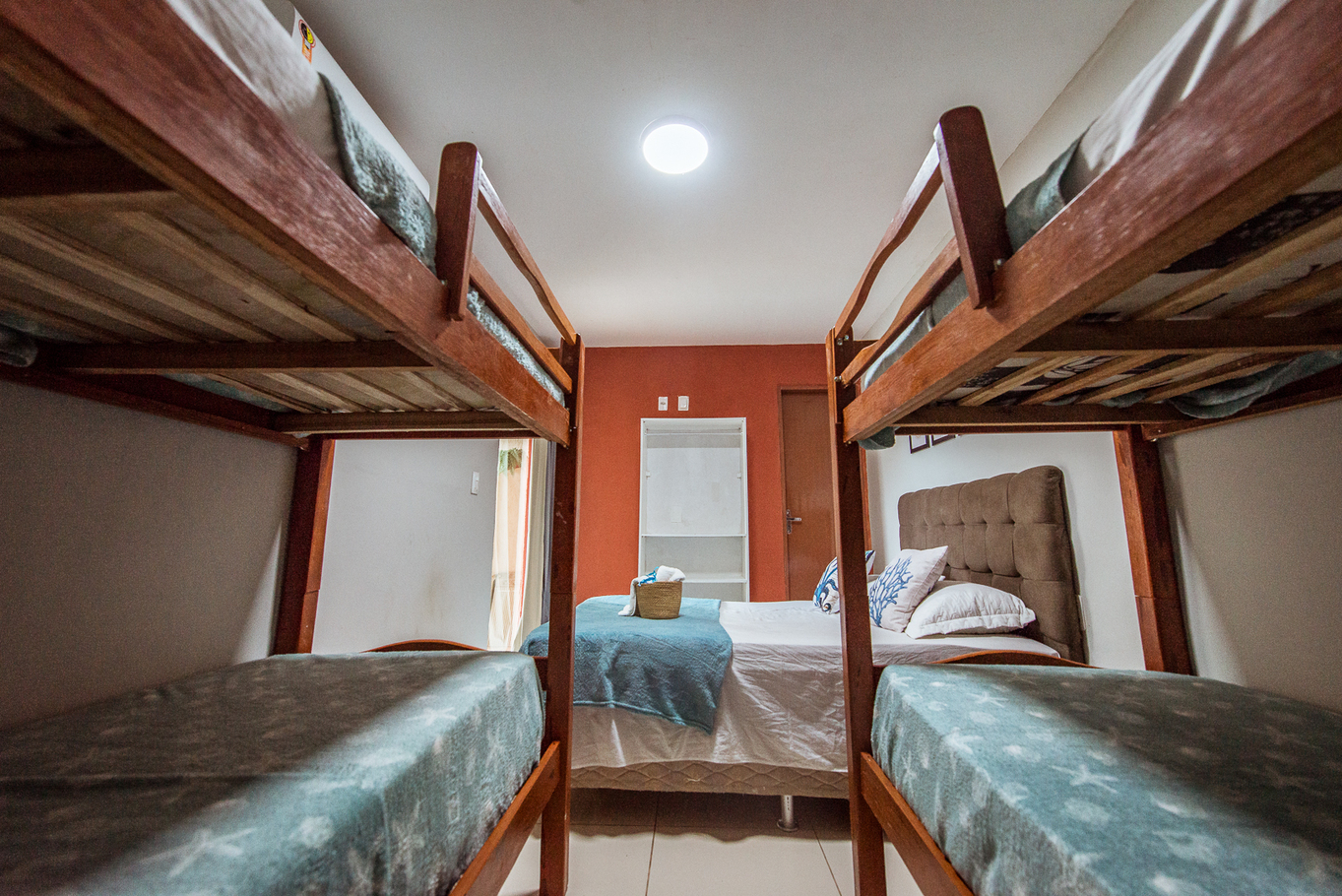 - Quarto 3 (suíte): cama de casal, duas beliches, ar-condicionado e banheiro com box de vidro