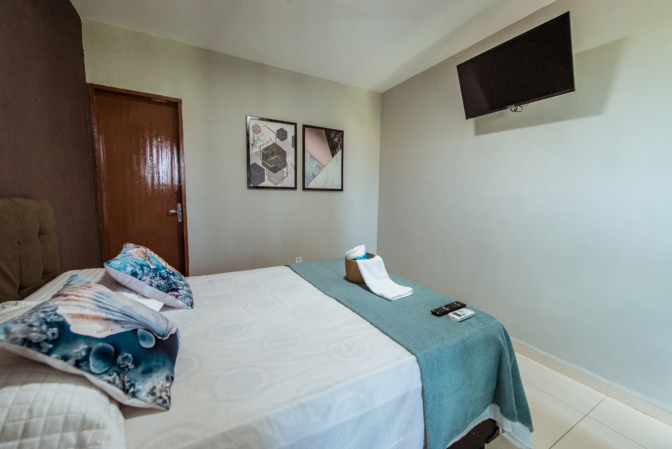 - Quarto 4 (suíte): cama de casal, ar-condicionado, Smart TV e banheiro com box de vidro