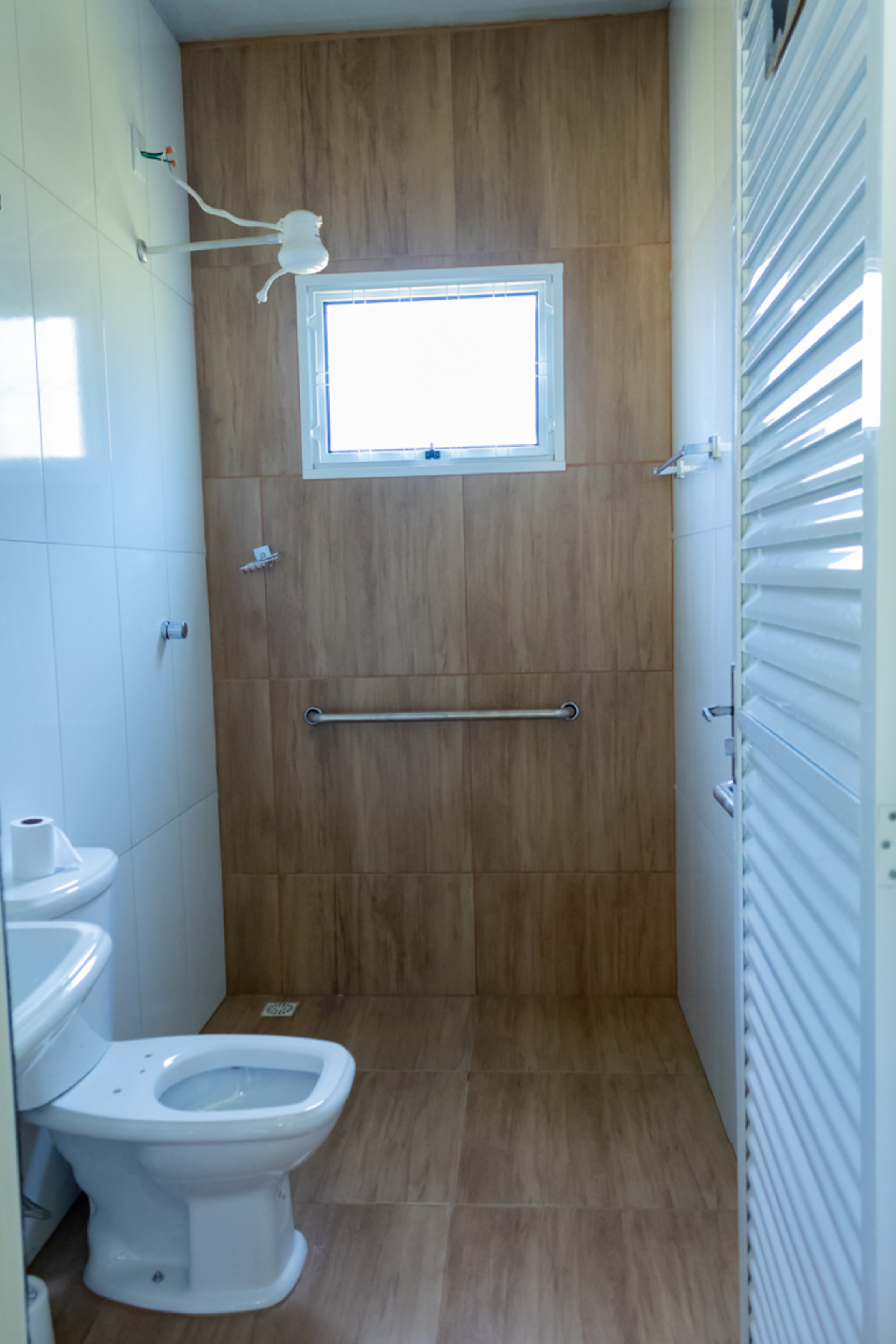 - Os banheiros são equipados com chuveiro elétrico e não há box