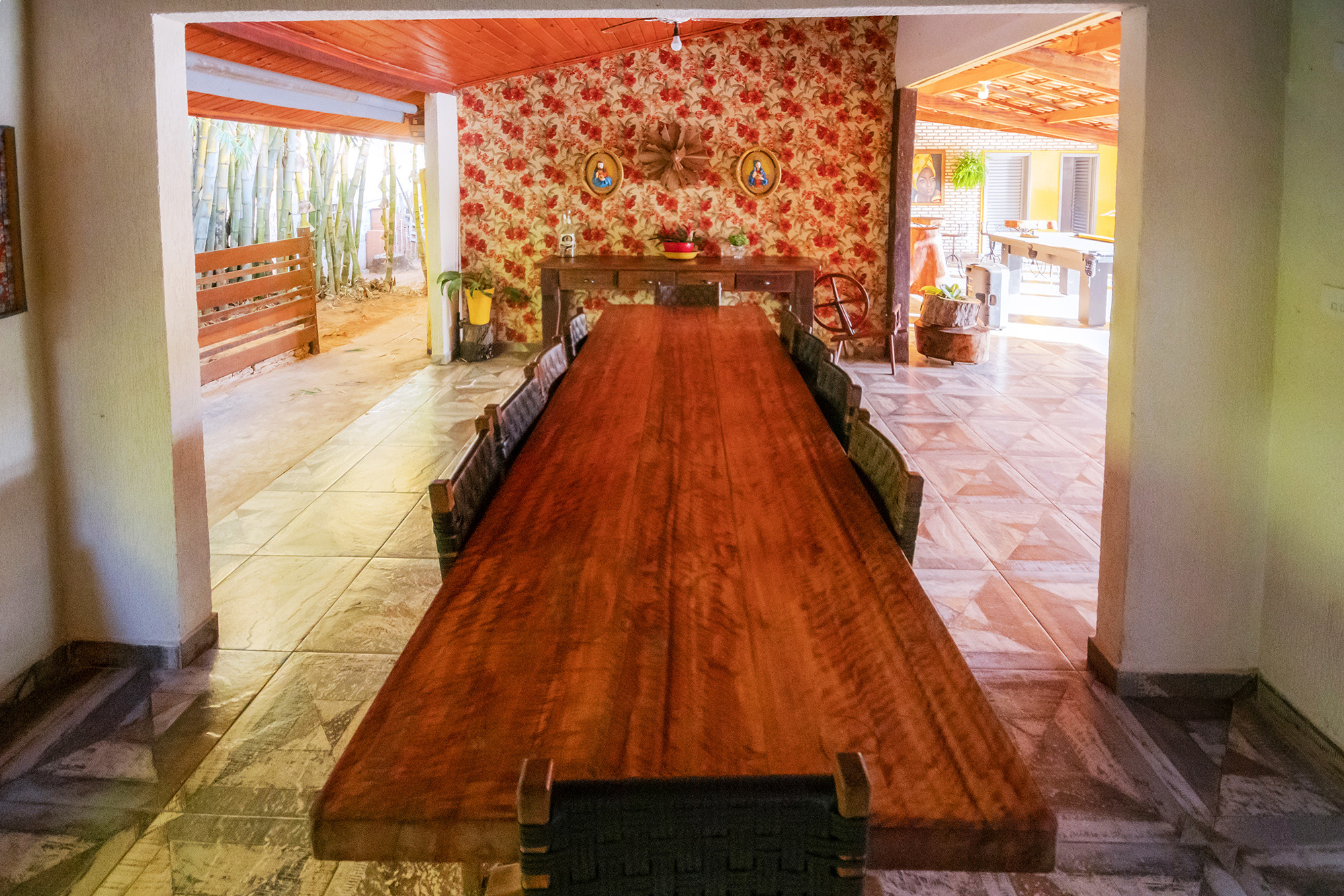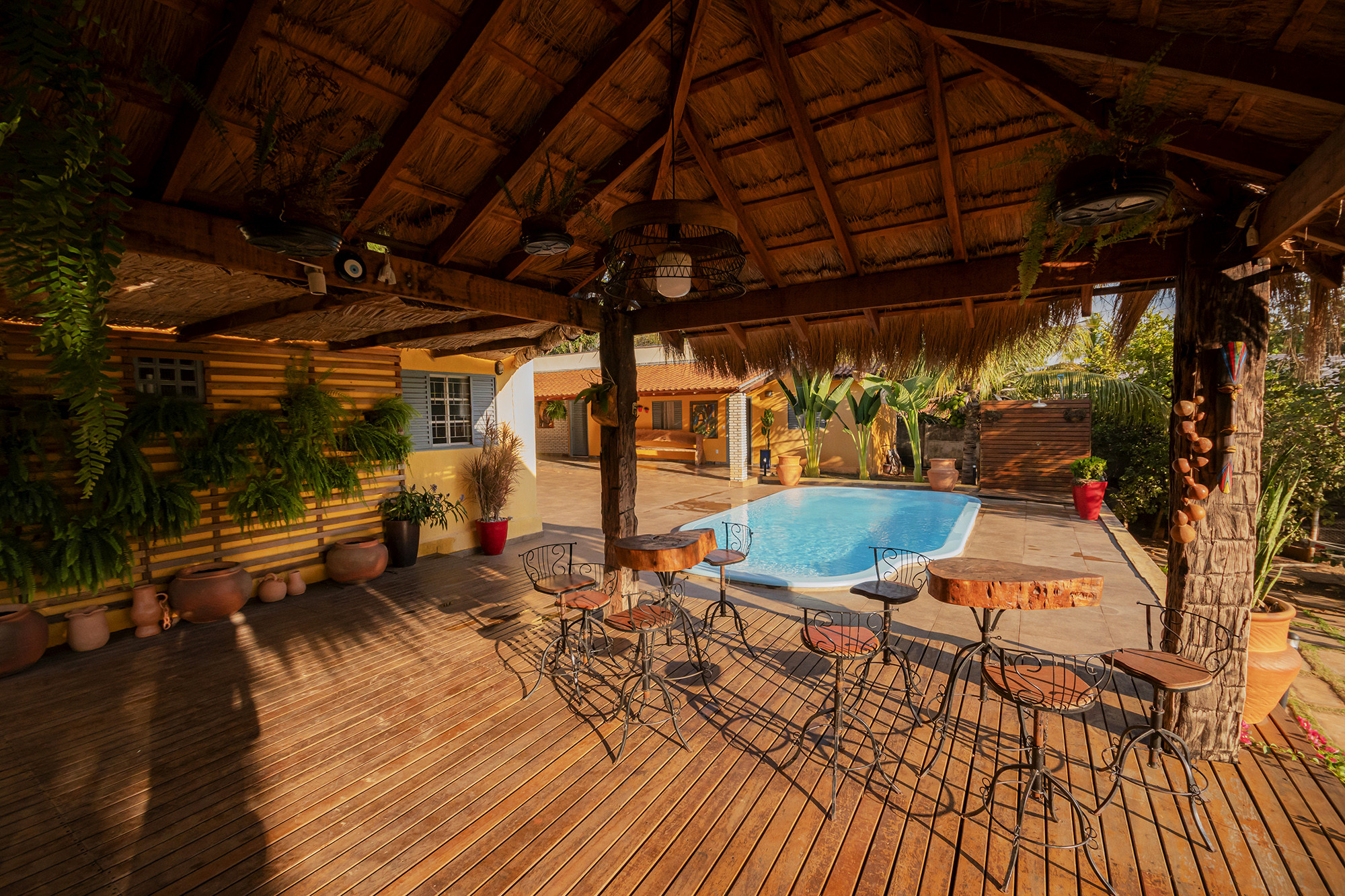 - A sala de estar é externa e bem ampla, fica na varanda coberta do rancho, nela você encontra TV, mesa de sinuca, diversos bancos, mesas e cadeiras de madeira