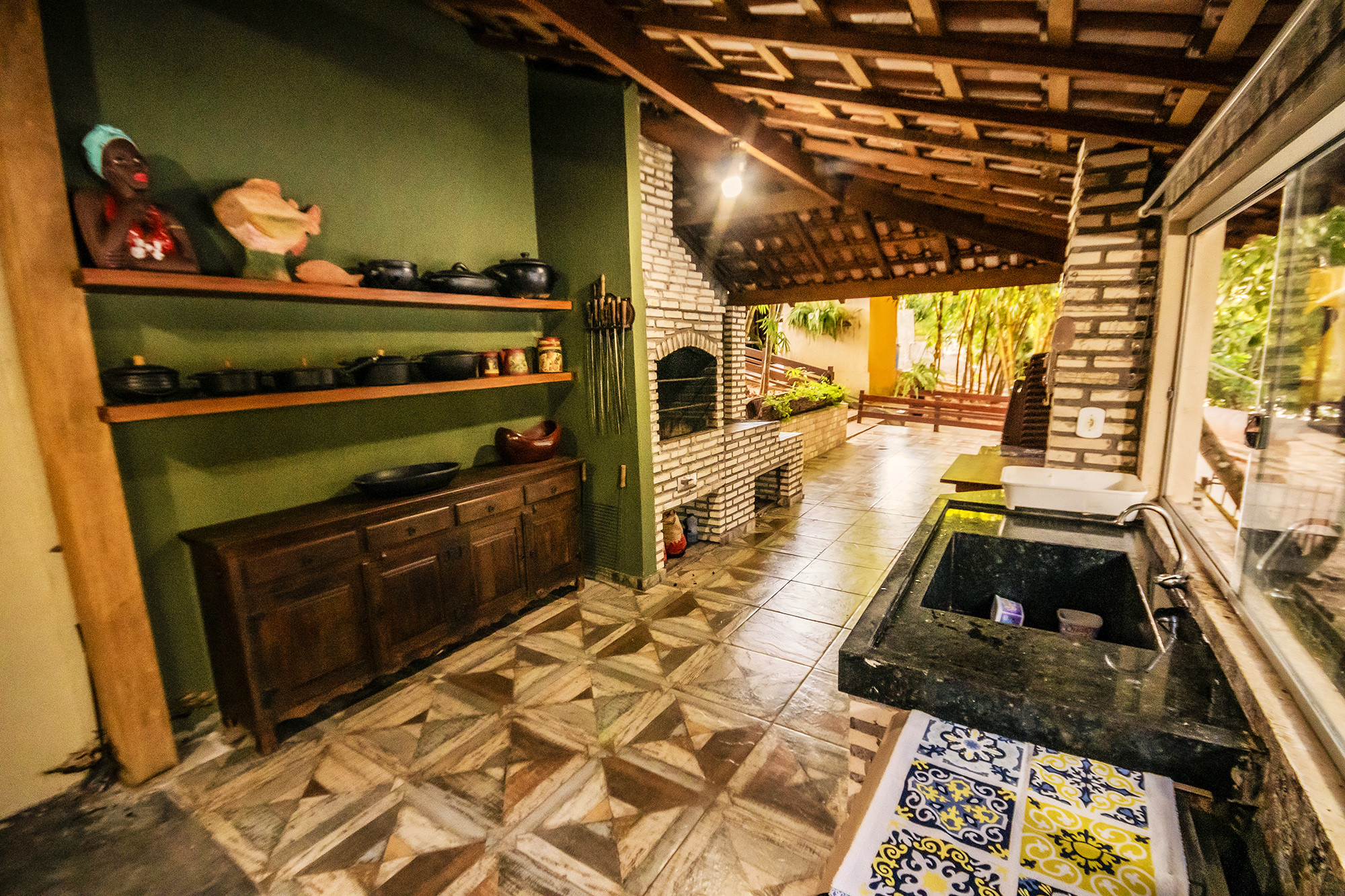 - Área gourmet com churrasqueira, fogão a lenha, geladeira duplex, freezer vertical e mesa picnic