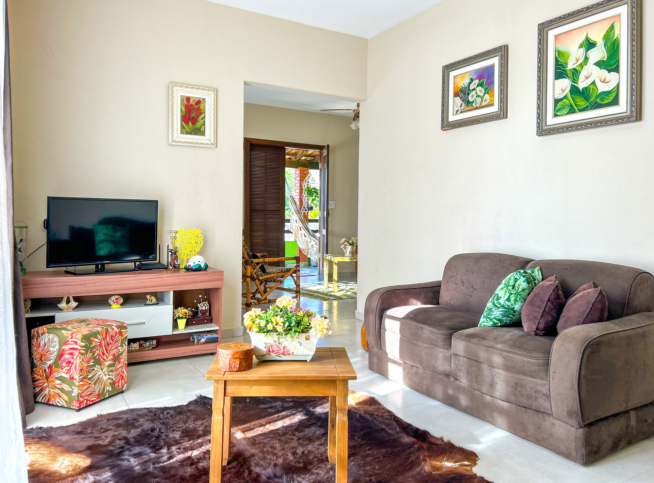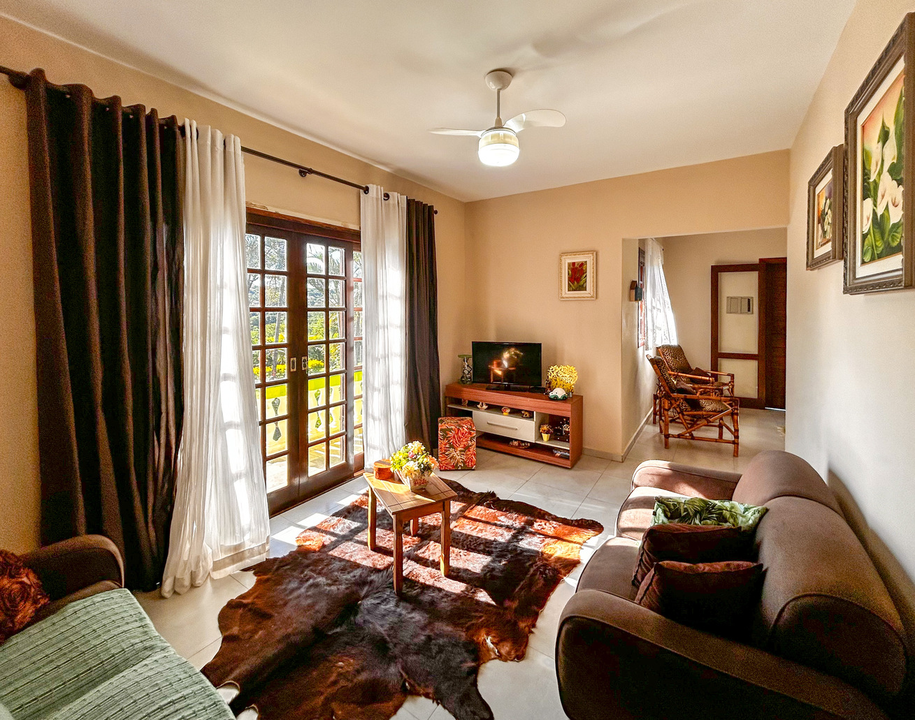 - A sala é bem confortável e nela você encontra mesa de centro, poltrona, sofá, TV e ventilador de teto